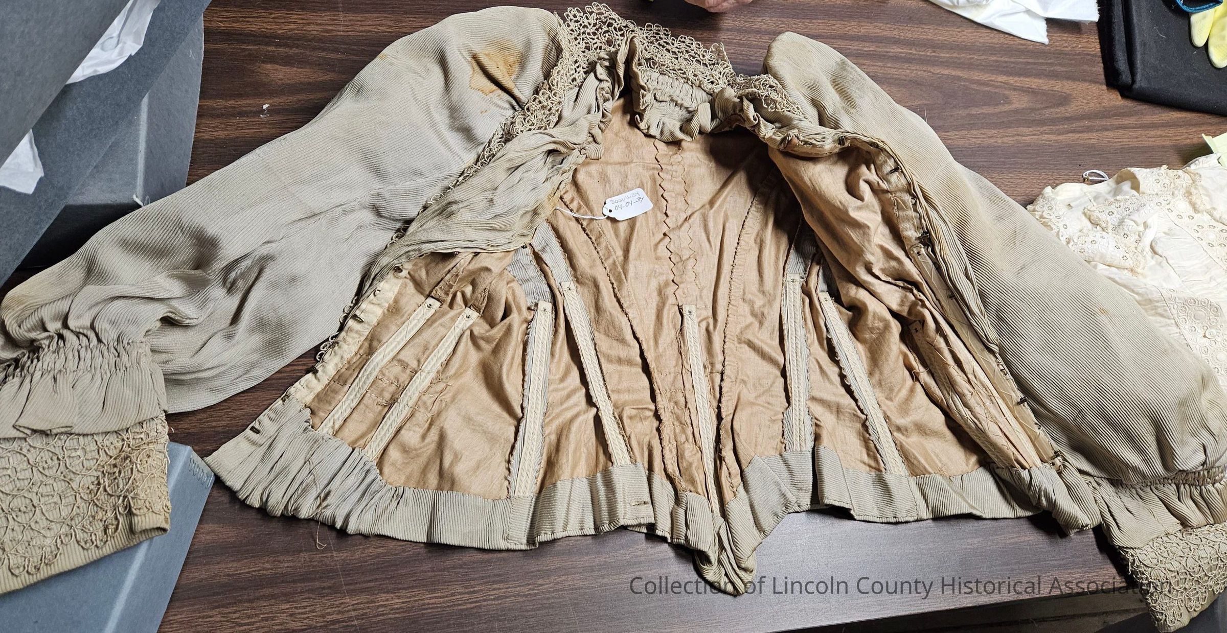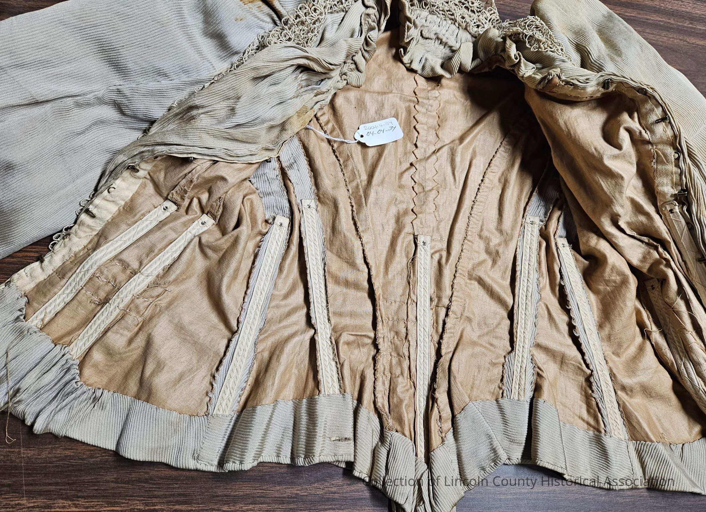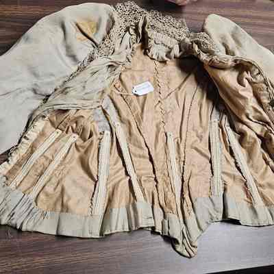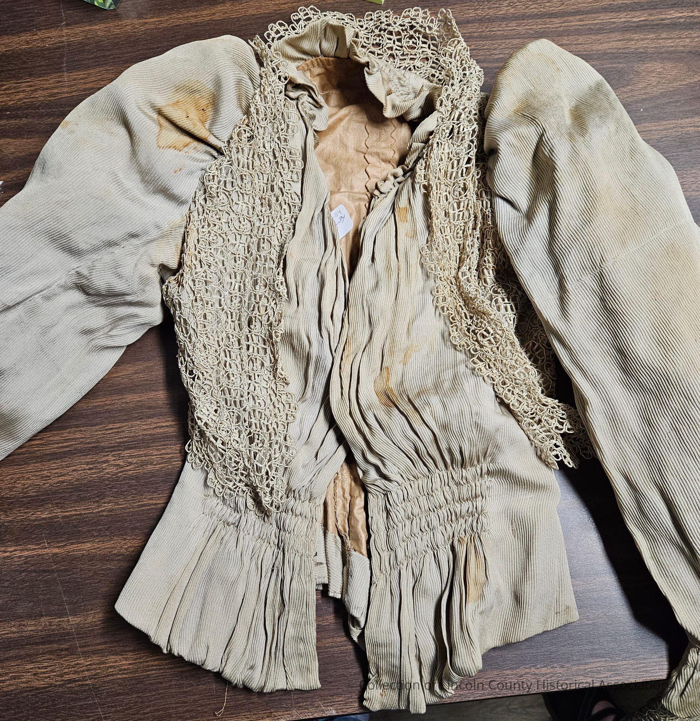 Late Victorian bodice. Ribbed beige silk bodice. Netted/crocheted lace around the neck and where two sections connect in front. Whale boned and machine sewn.Clothing/Dress/Costume Details