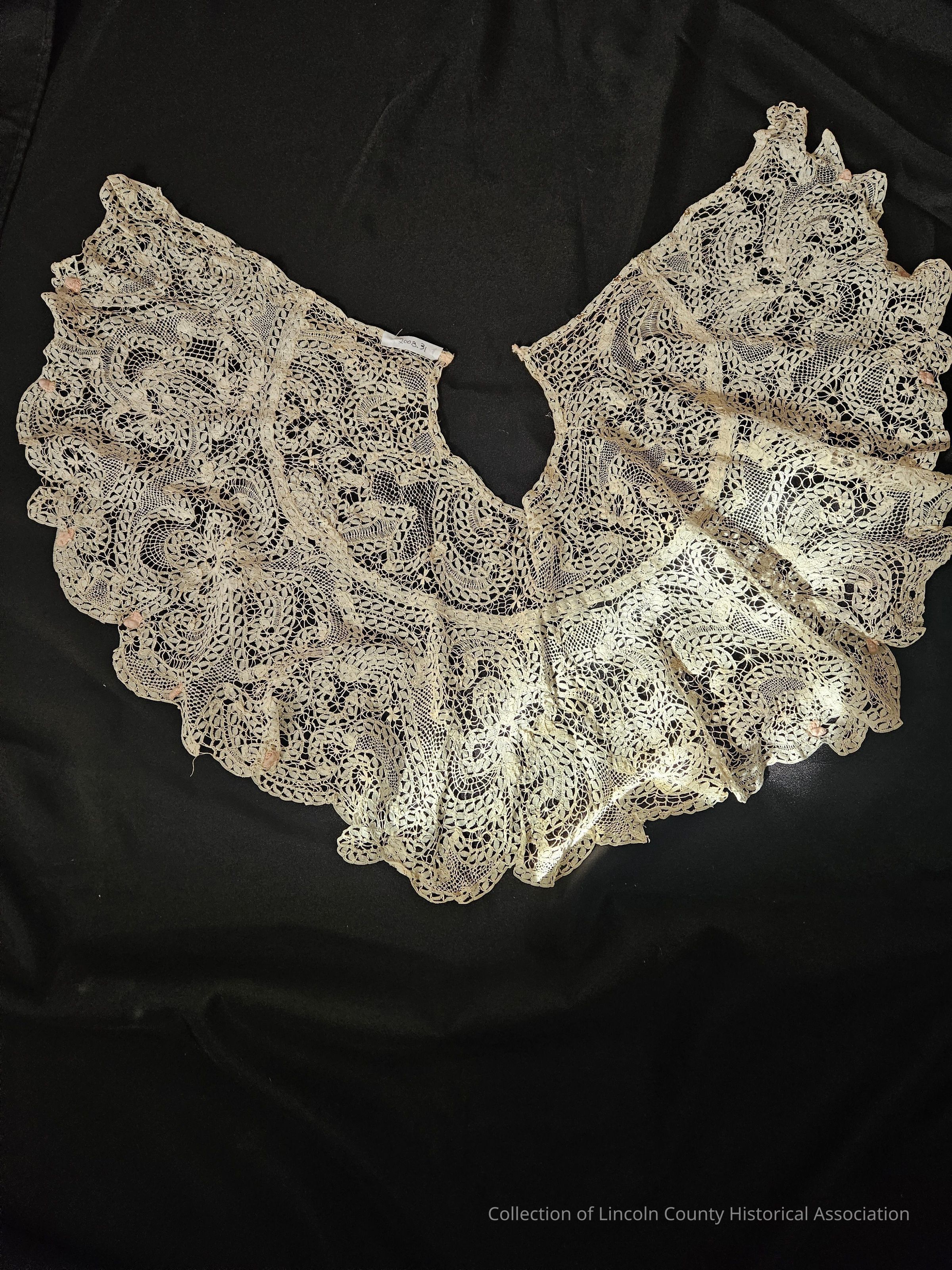 Large white lace collar with swirl design. Raised pink roses around the edges. Scalloped edges. Three small button closures and two hook closures at the neckline. Handmade lace.Clothing/Dress/Costume Details