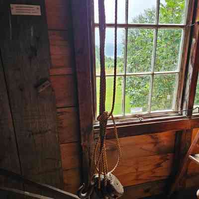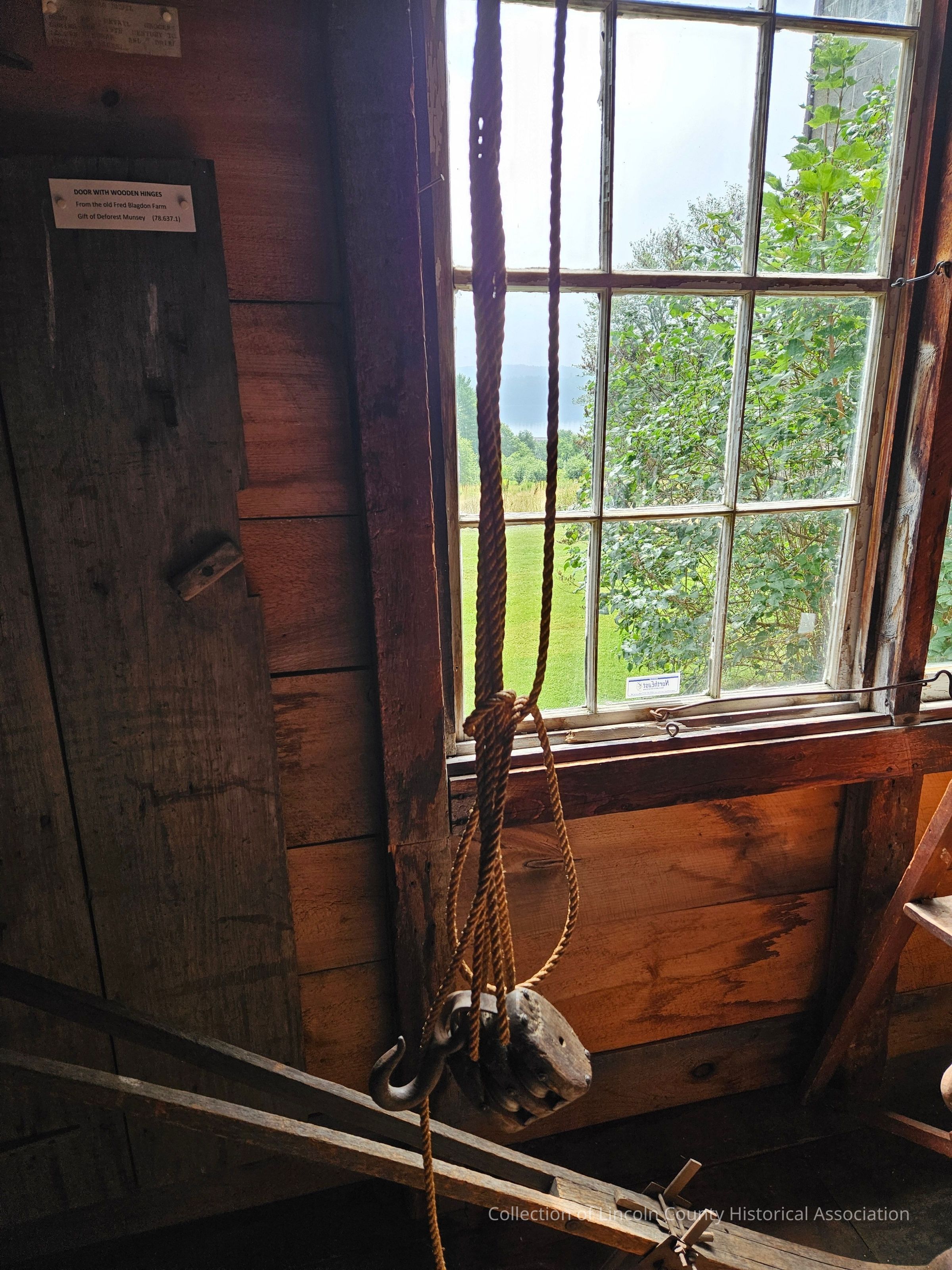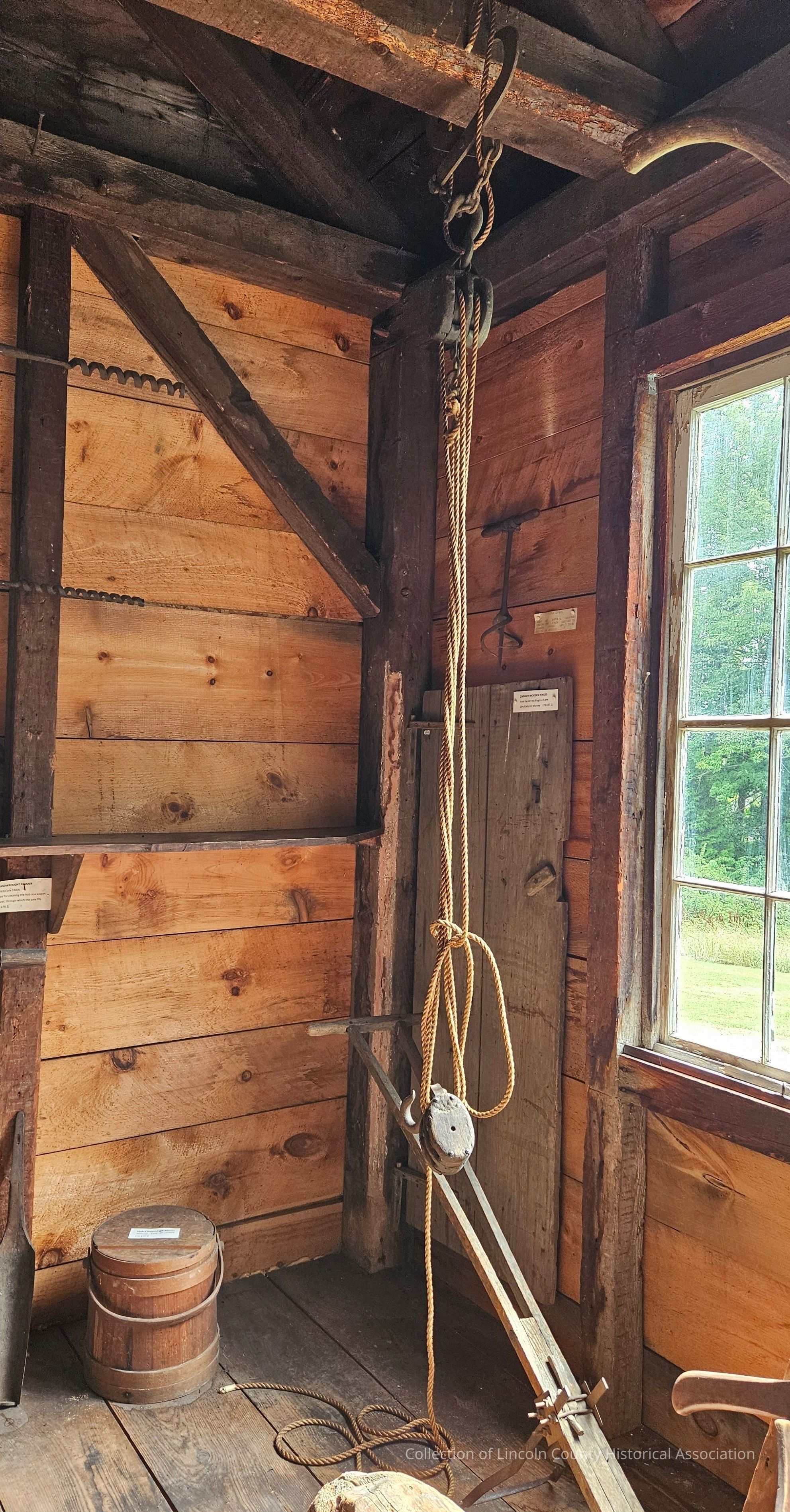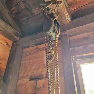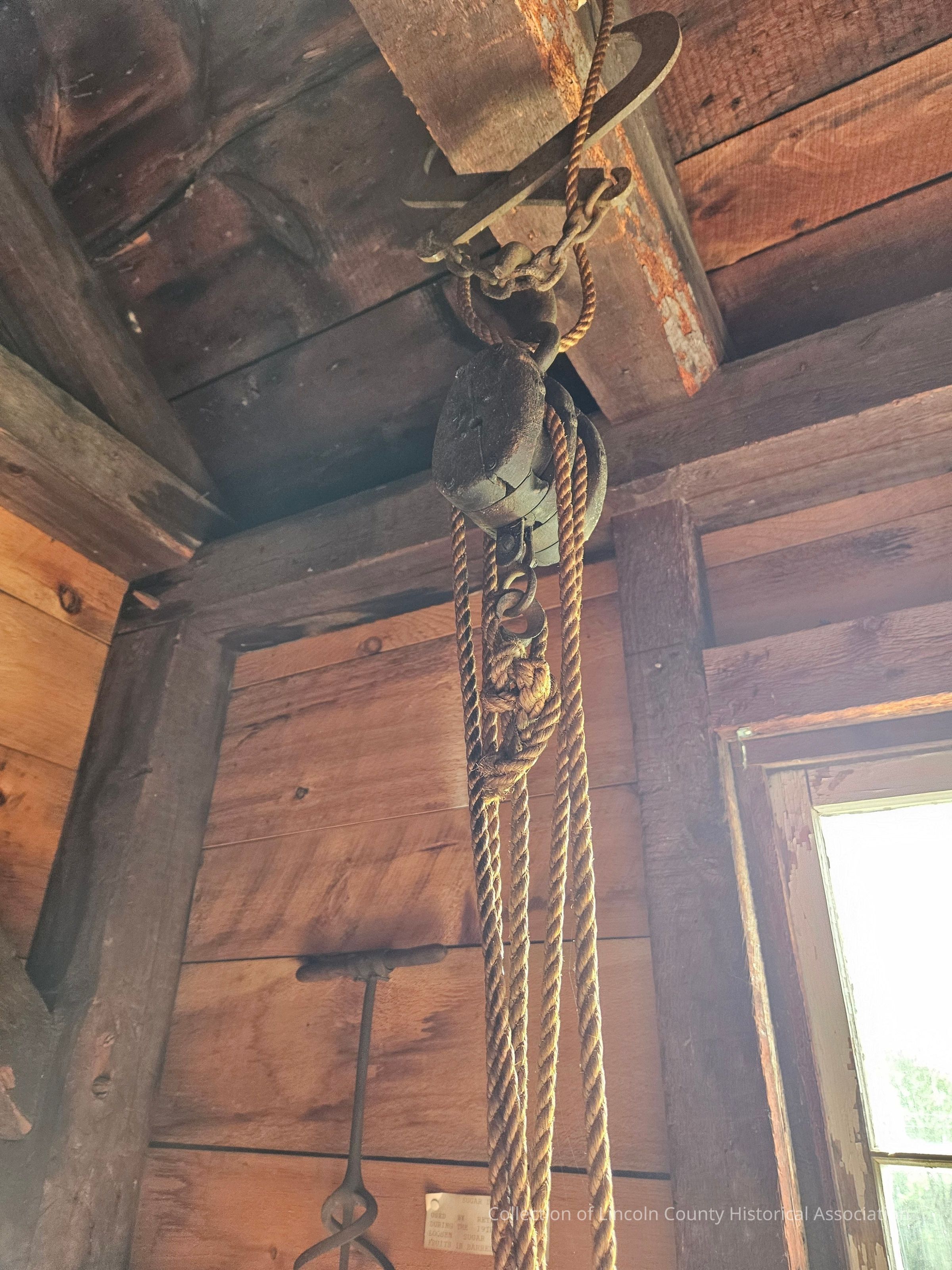 Block and tackle pulley system consisting of two wooden blocks connected by rope. Two wooden blocks with metal sheaves. Each block has two "double blocks" which are iron bound and riveted in place. Each block also has a large hook and upper block has a ring at its bottom, a hook at the top and is attached to timber tongs.Made/Created