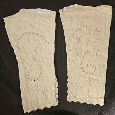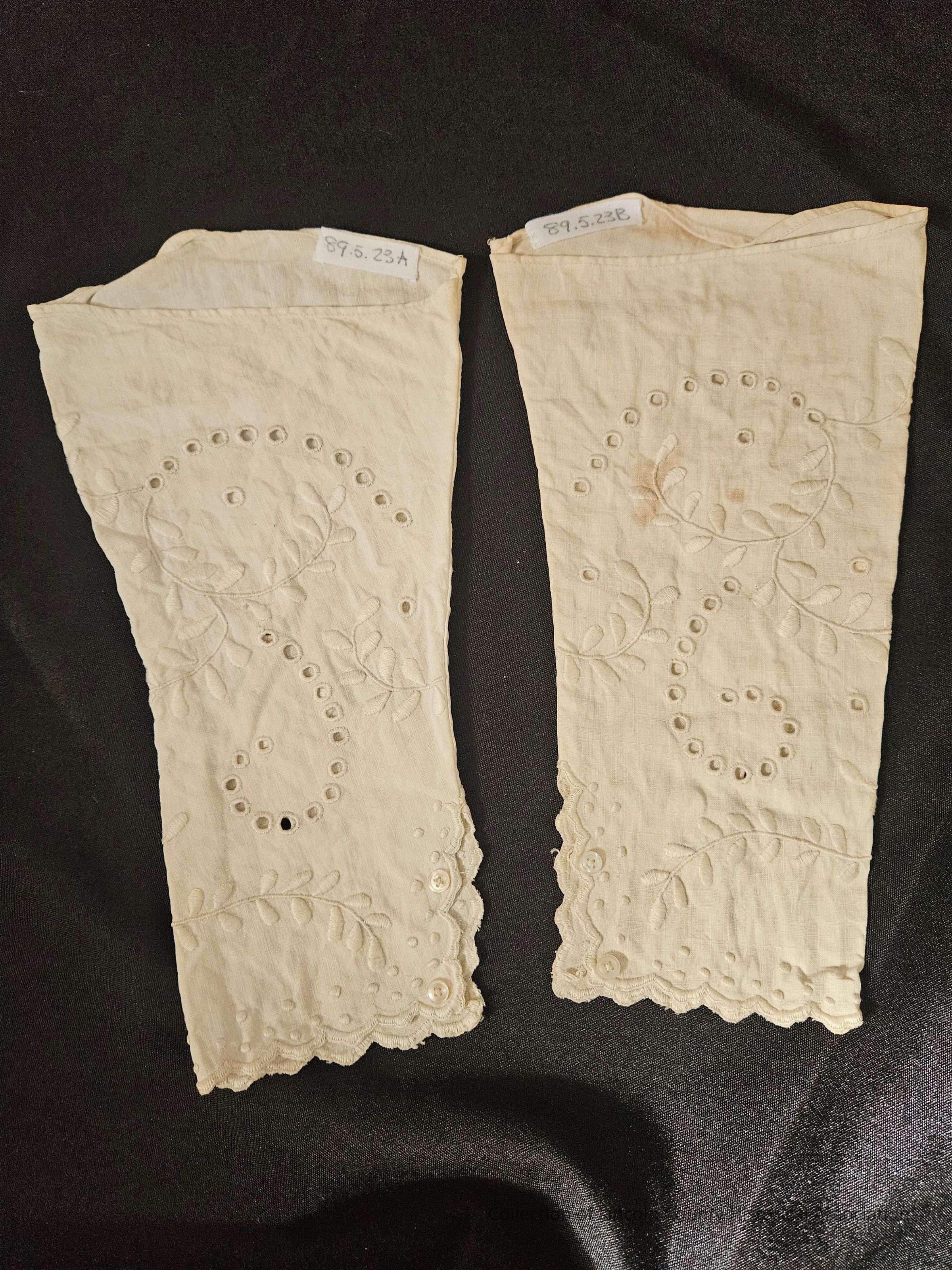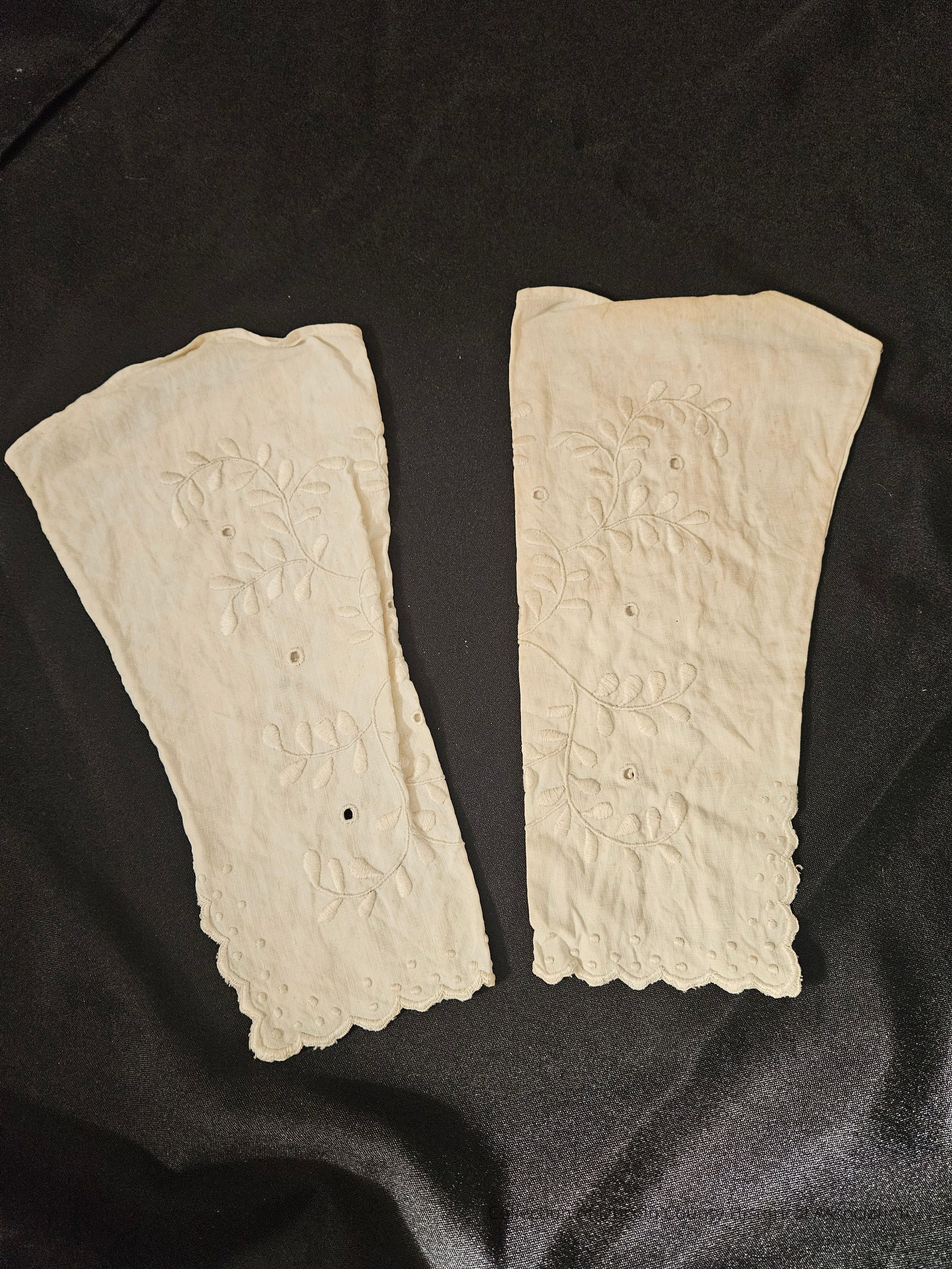 Pair of white cotton tight fitting sleeves. Hand embroidered with leaf design. Scalloped edges with two buttons.Clothing/Dress/Costume Details
