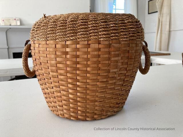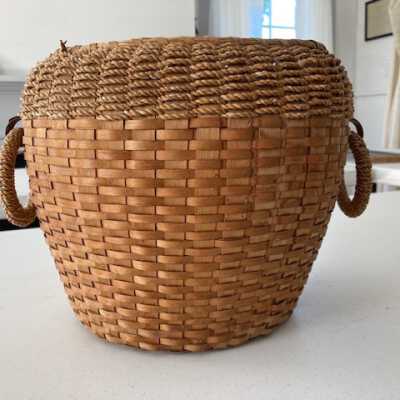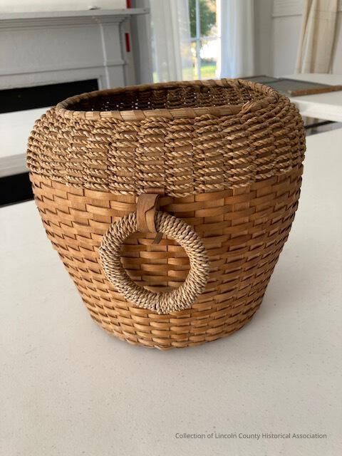 Circular Native American splint basket with false embroidery on shoulder above the handles (approximately the upper fifth). Handles attached to the basket sides. Lacks colored decoration. False decoration is Hong Kong cord. Identifiable as a jardiniere.Made/Created