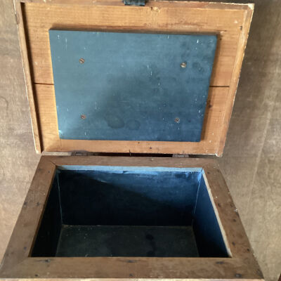 Arctic butter box lined with manson slate. Wood with iron corner straps, hinges, lock and handle.