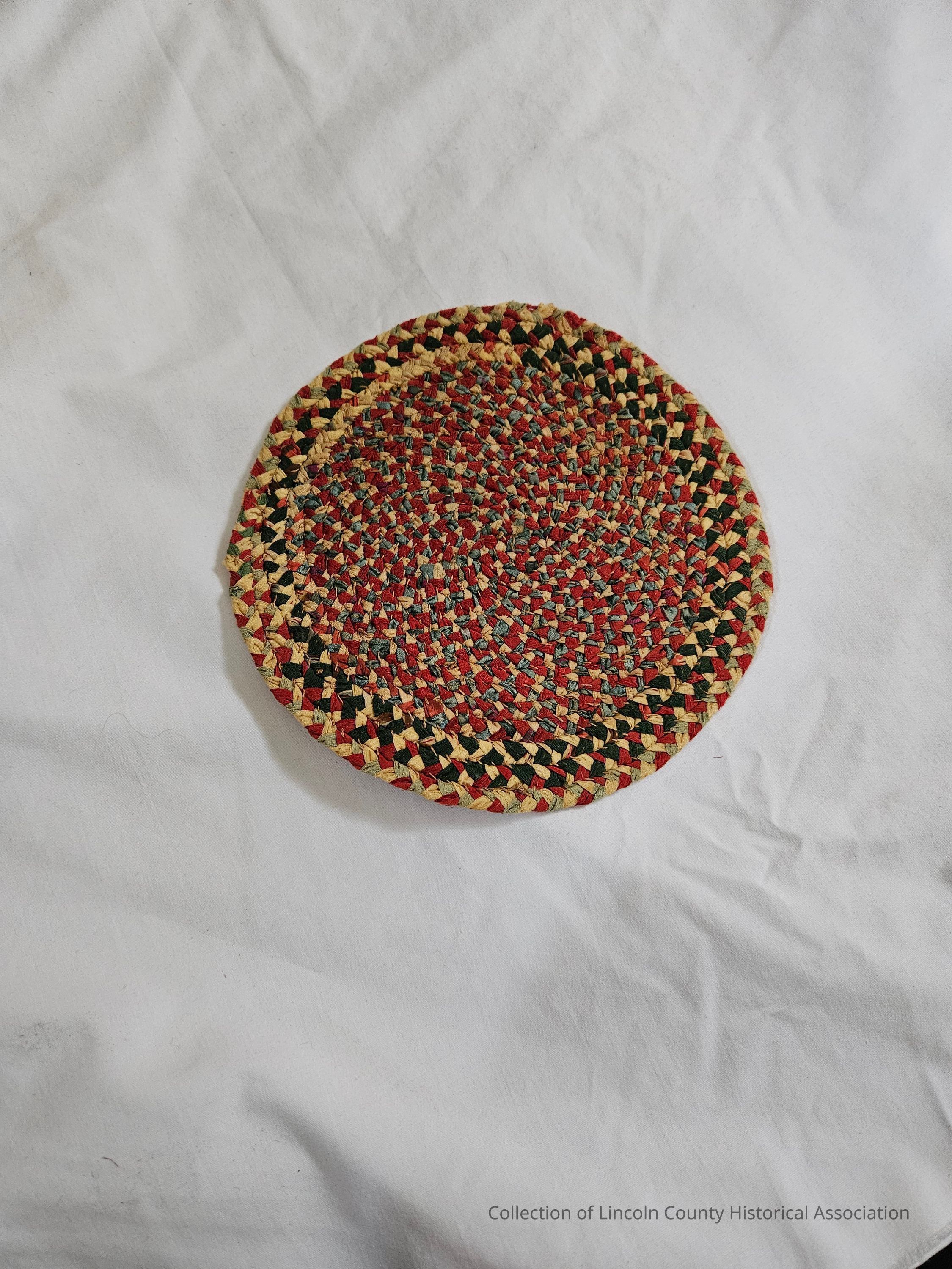 Small decorative braided rug/mat. Circular in shape. Multicolored, mostly red and blue with tans and greens.Made/Created