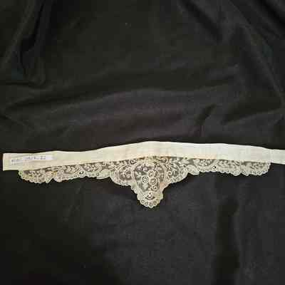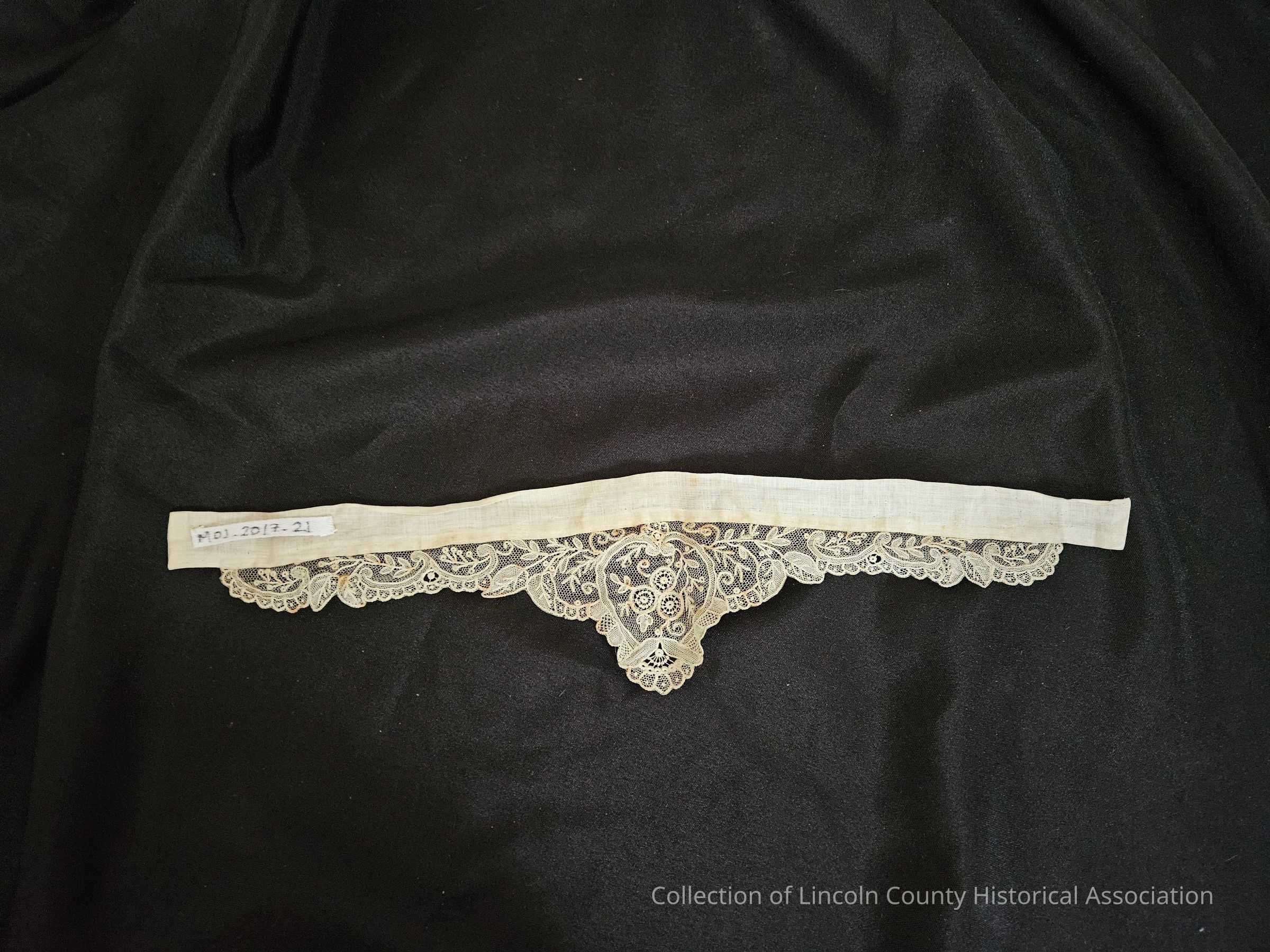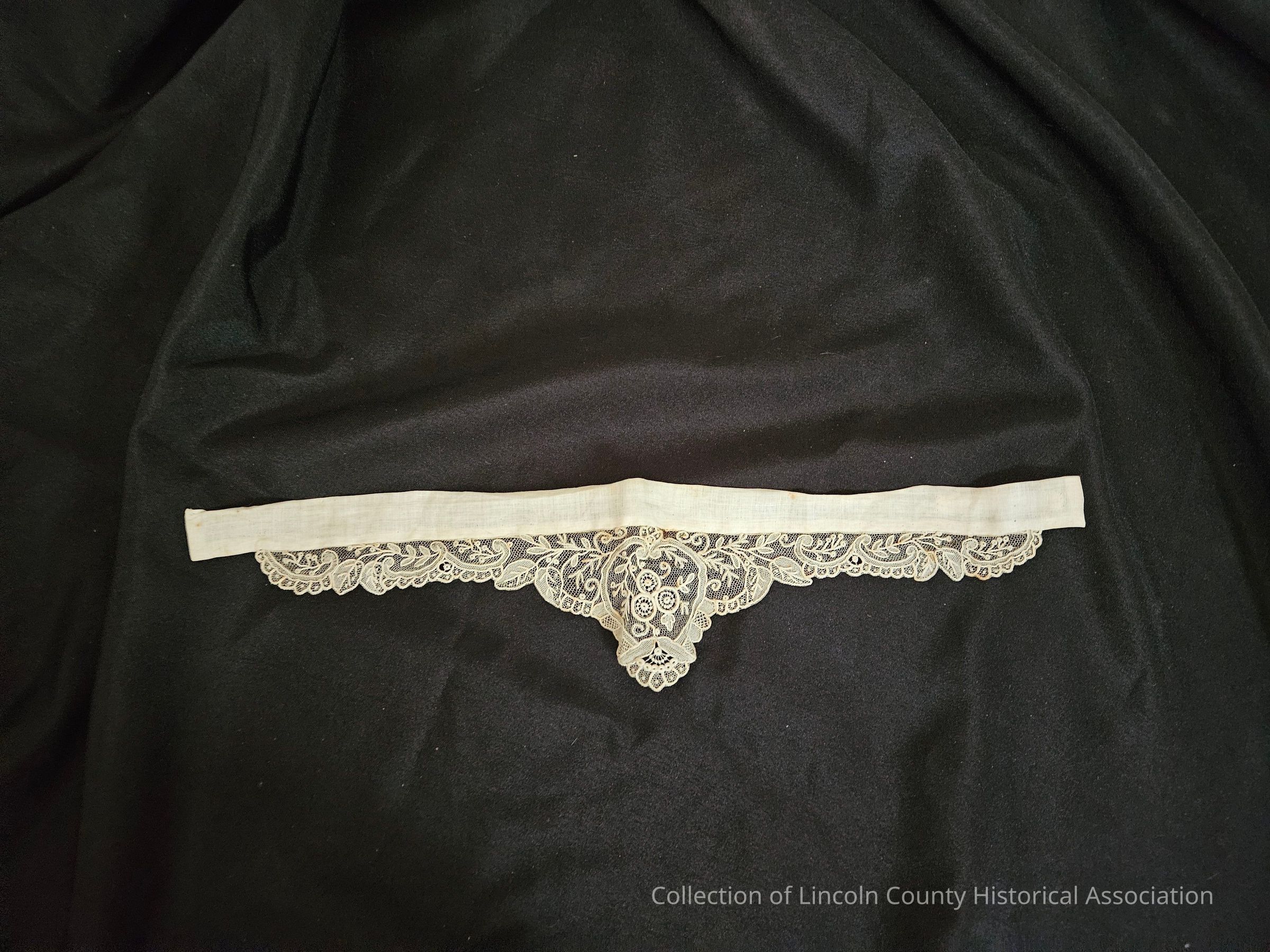 White collar composed of plain cotton strip attached to triangular shaped lace piece. Hand stitched.Clothing/Dress/Costume Details