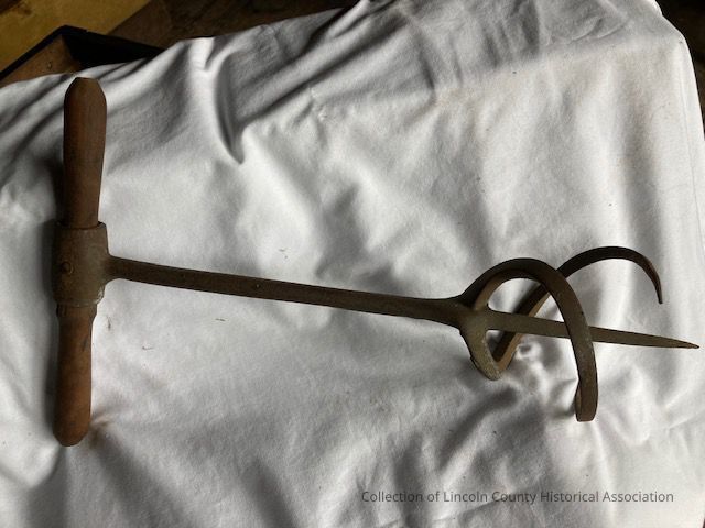 Sugar devil. Cast iron implement with a wooden handle. Main iron bar tapers to a triangular point and has a three-sided blade curving outward