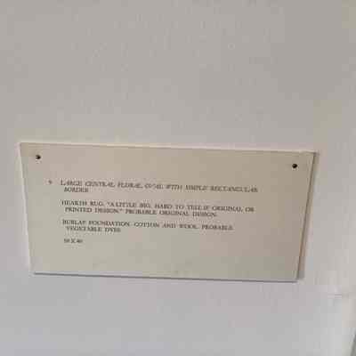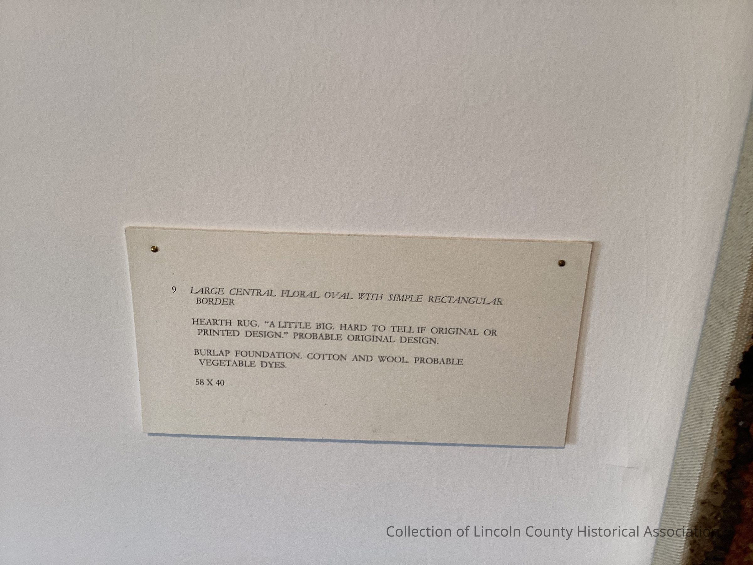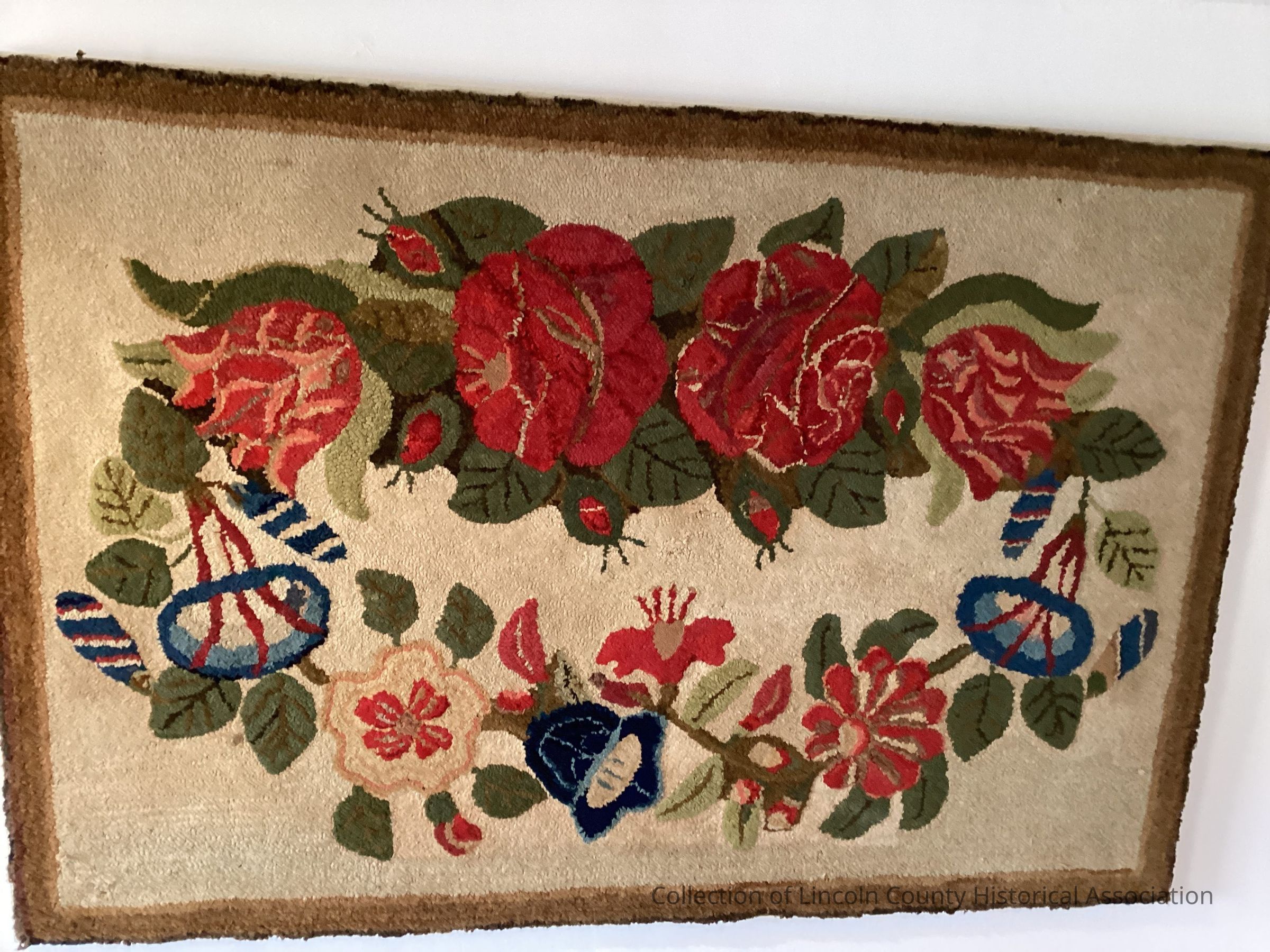 Large rectangular hooked rug. Floral oval with large red roses and other red and blue flowers. White and tan background. Burlap foundation. Cotton and wool yarn. Vegetable dye.