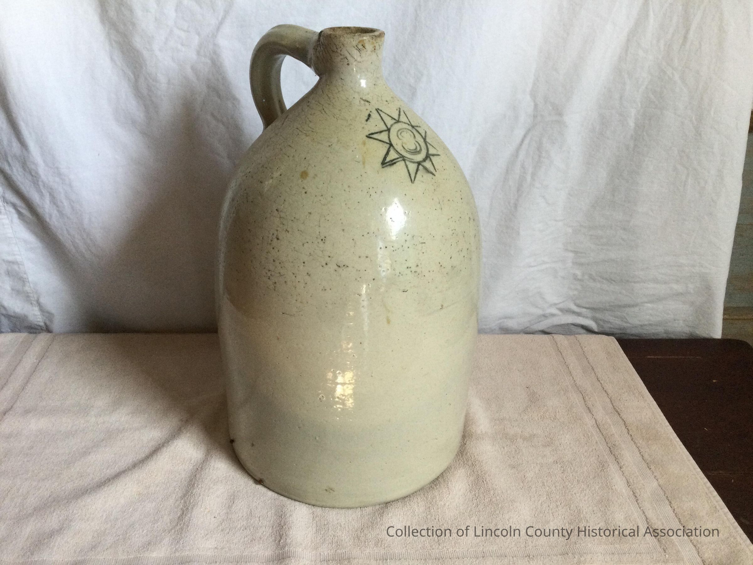 Cylindrical three gallon stoneware jug with a single looped handle. Whitish gray glaze and with a cobalt blue eight pointed star on shoulderMade/Created