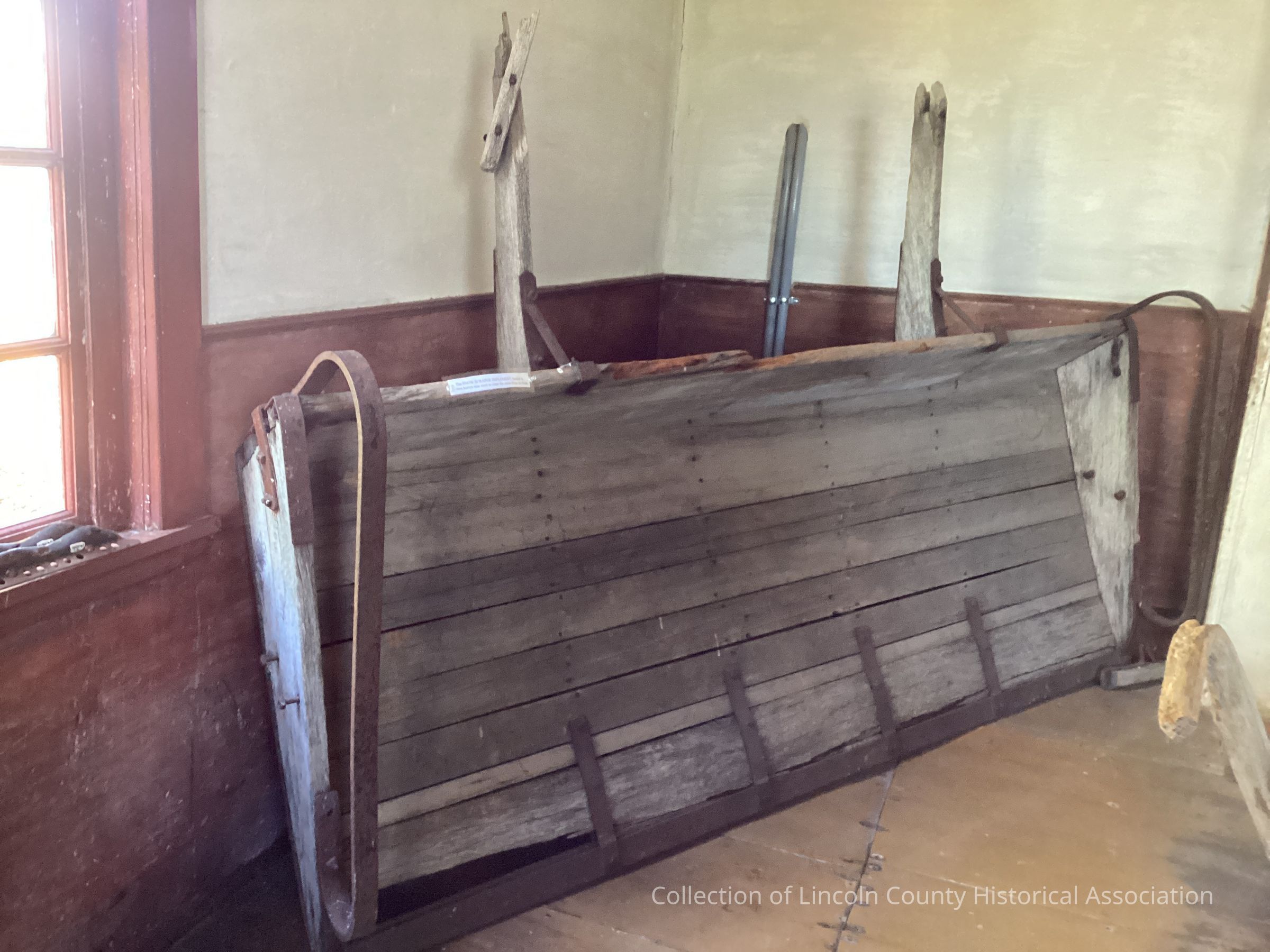 Wood and iron ice scraper. Long scoop to be drawn by a team of horses to clear snow from the ice. Wood with iron edgeMade/Created