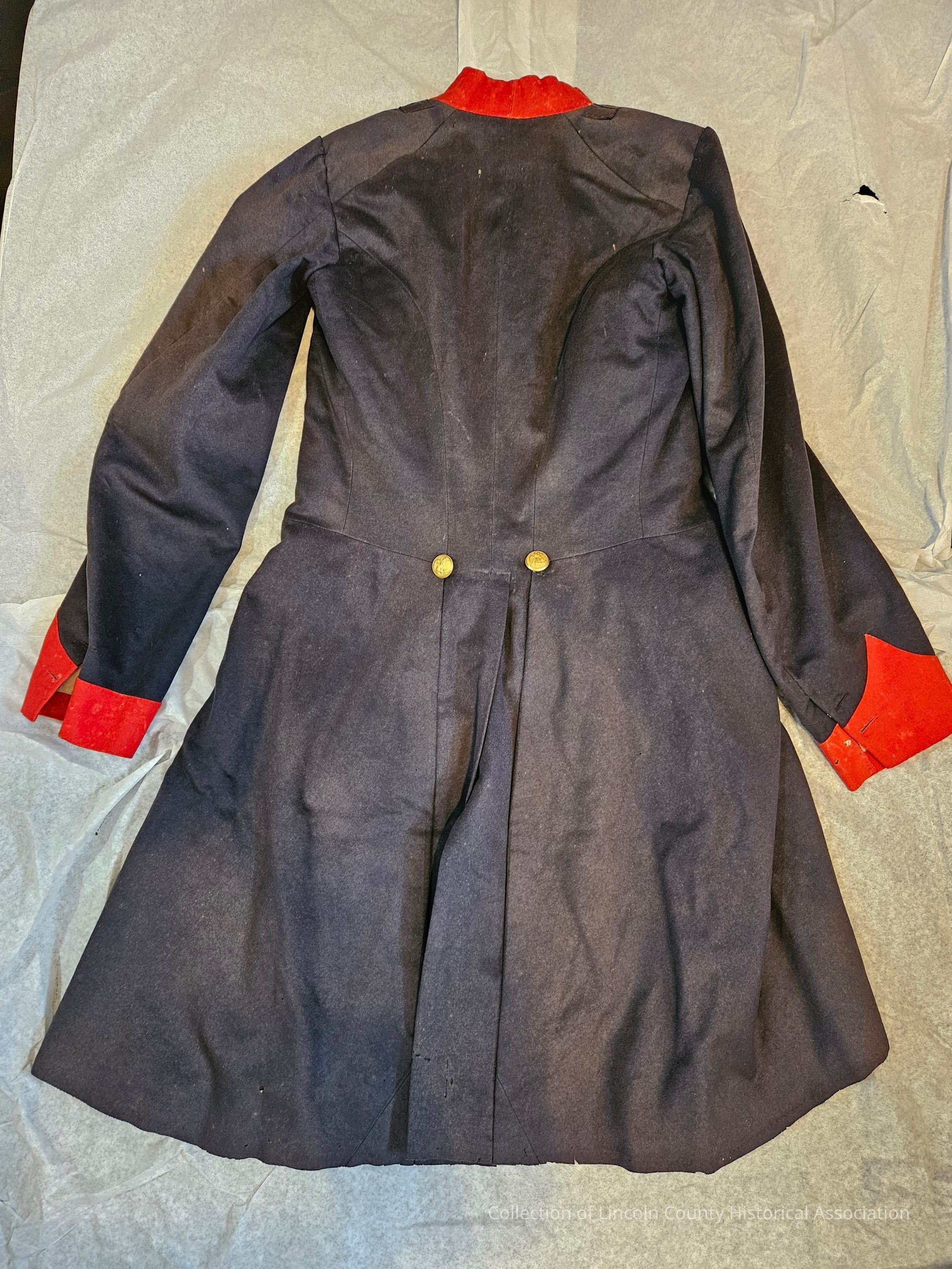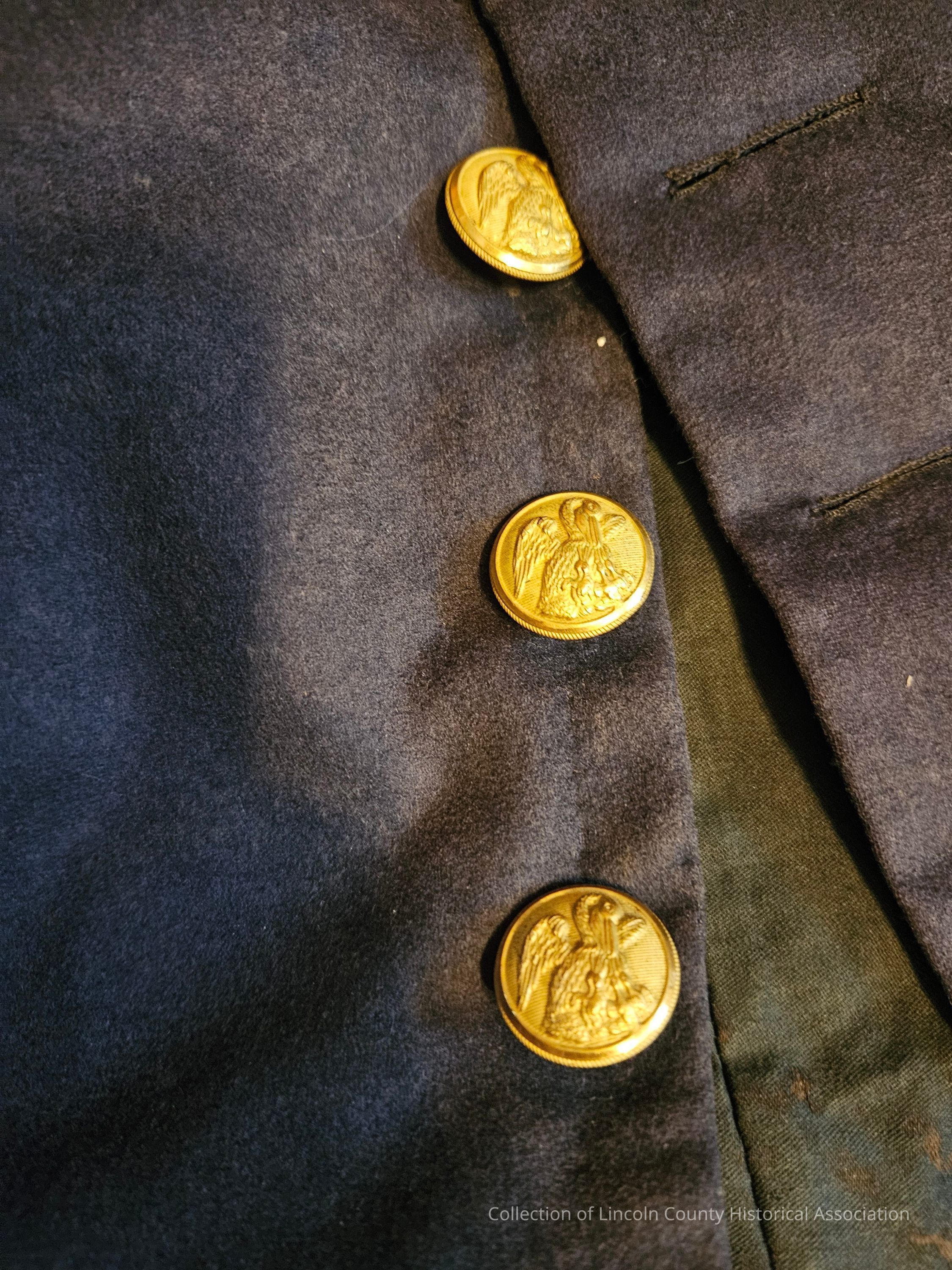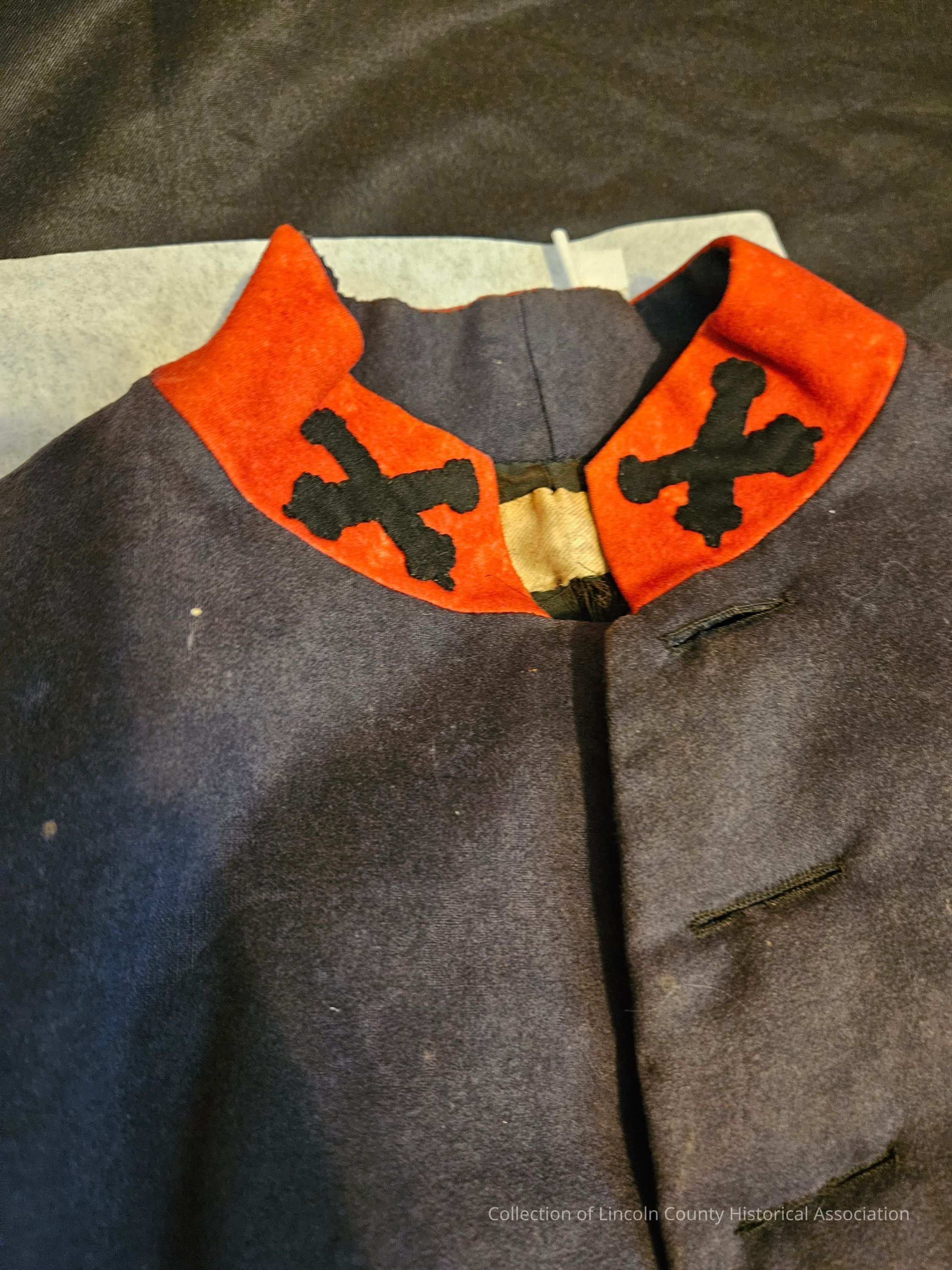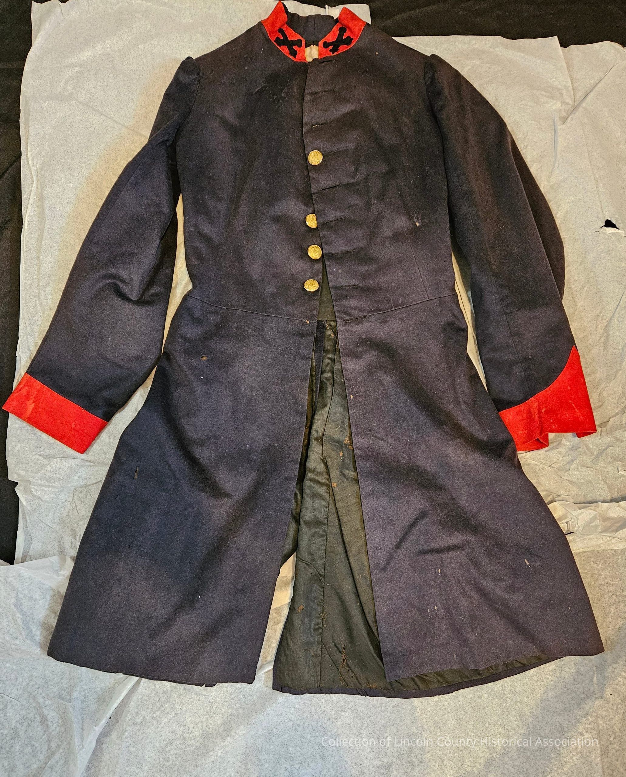 George G. Trull was born in Boston, Massachusetts in 1833. He worked as a machinist before the Civil War. He married Octavia J. Harvey (1844-1911) on January 11, 1859. They had two children Ethel Moore Trull Bird (1859-1937) and Harold G. Trull (1861-1863). Harold died of diphtheria. George joined the Second Massachusetts Battery of Light Artillery on July 31st, 1861 as a second lieutenant. On December 18, 1861, he became a first lieutenant. On October 21, 1862 he transferred to the Fourth Massachusetts Battery of Light Artillery and promoted to captain. He mustered out in October 1865 and returned home to Boston where he worked as a state constable. He died on December 27, 1880. This uniform has pelican buttons on it. This could mean that it is a Confederate uniform as the pelican is the state seal of Louisiana but have nothing to do with either of Trull's regiments. George spent a lot of time in Louisiana during the war, so he could have taken this uniform coat home as a souvenir. The coat does not have epaulettes on it, which it should have since George was an officer. The missing epaulettes would support the theory that it is not his coat, however, it looks like their may be a spot to attach them on the coat. However, he also could have just purchased the buttons and put them on his coat while in Louisiana. LCHA has some of Trull's papers as well.