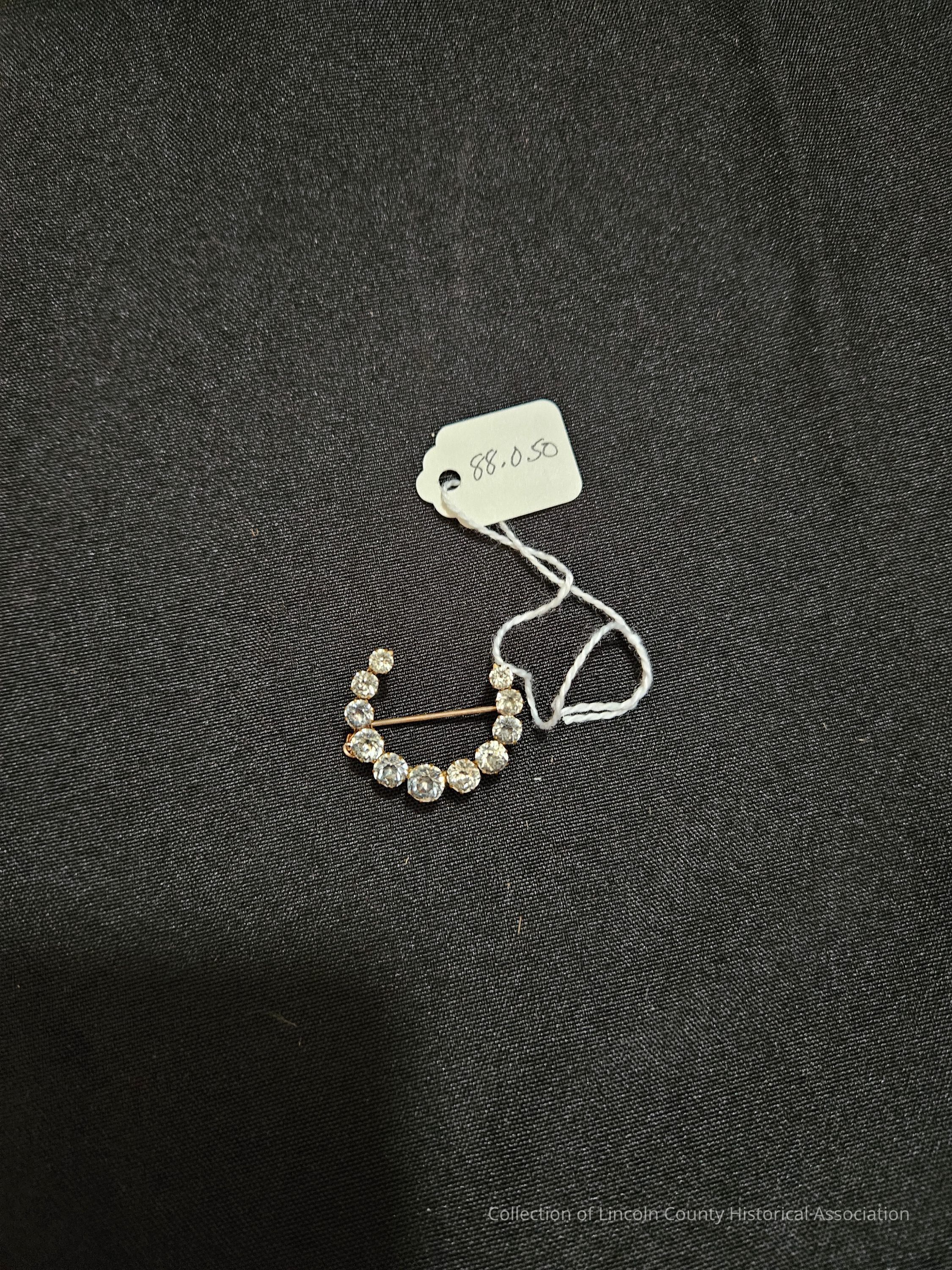Diamond and gold half circle brooch. Eleven diamonds line the brooch. Back of brooch is gold.