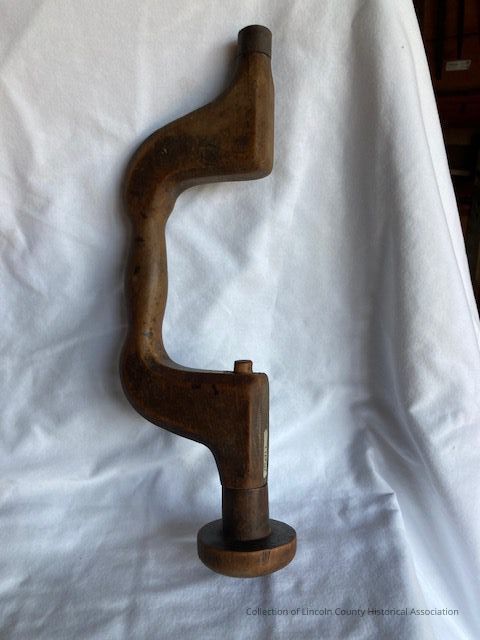 Wooden bit brace (also known as a bitstock). Smoothly shaped beech wood with rabbit edges and a well turned hand grip elbow. Its clamp is also made solely of wood. Has an iron ferrel (tip) which is a ring held in place by four cut nails.
