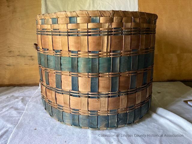 Large round Native American Penobscot splint basket with blackish and green decoration. Two small handles on sidesMade/Created