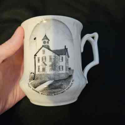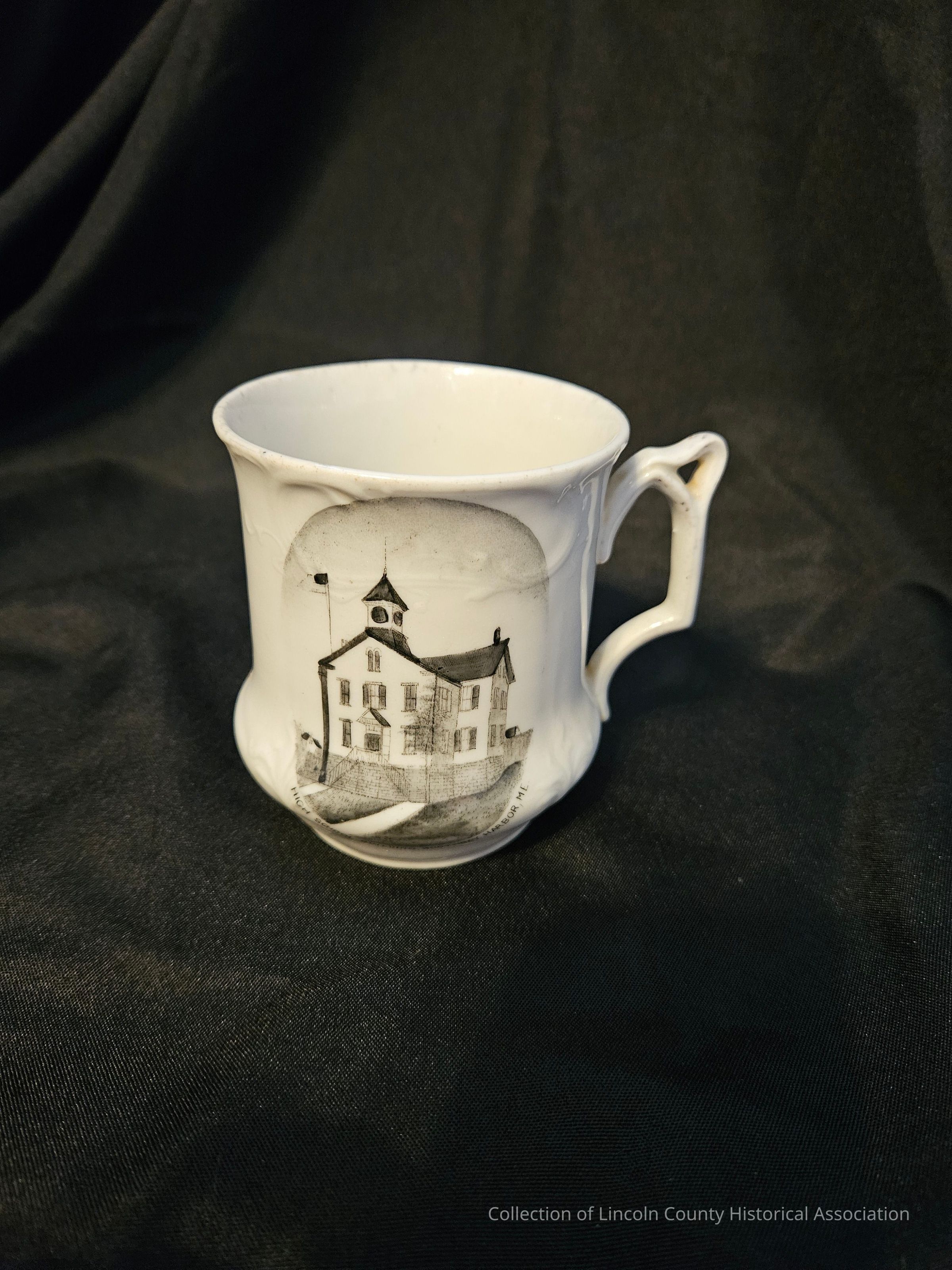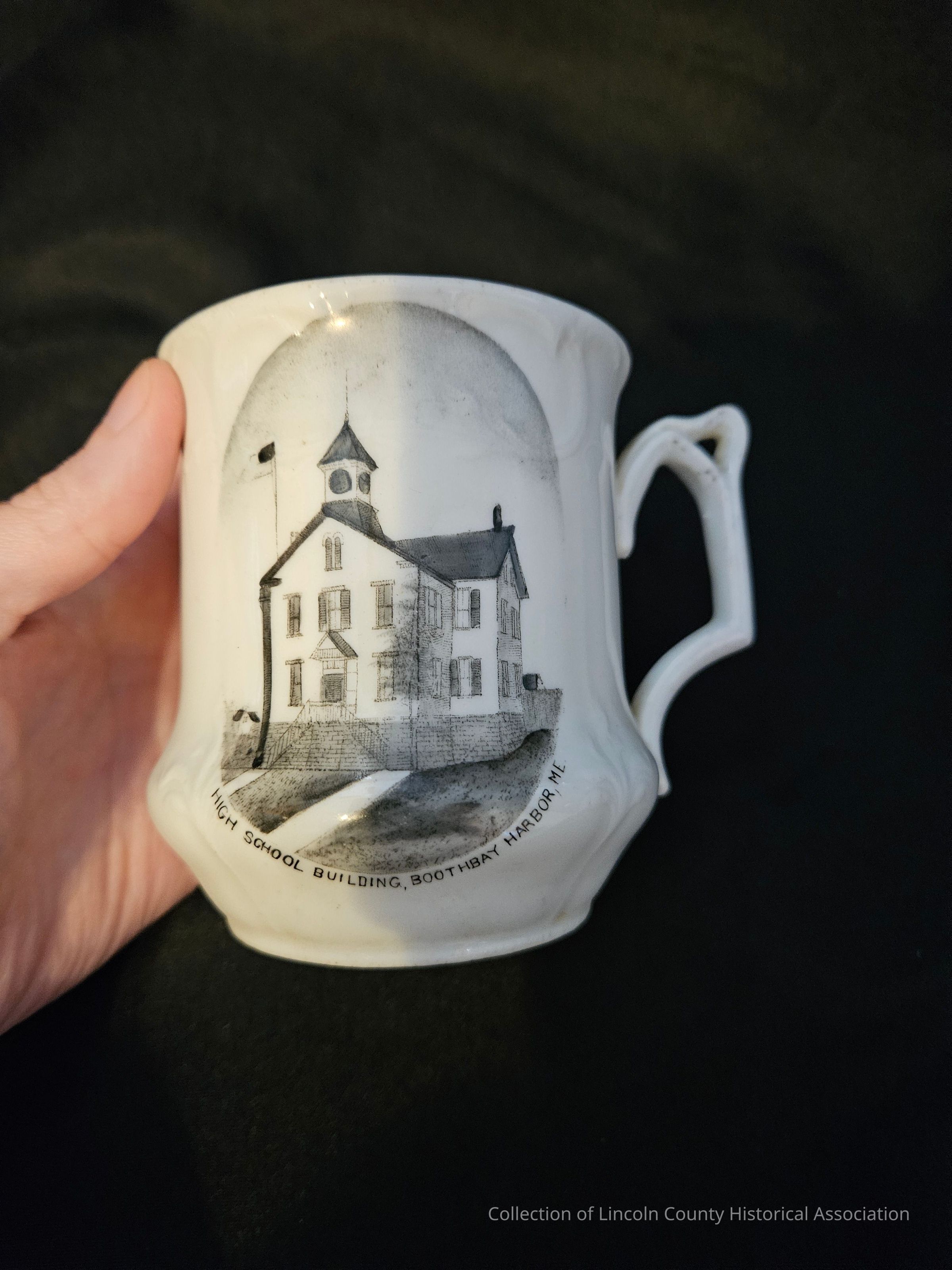 Large white commemorative cup with black and white image of Boothbay Harbor High School building. Cup is smaller at top and gets larger at base.