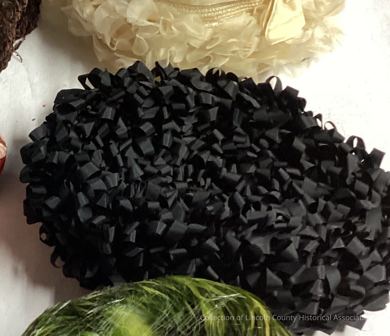 Black hat covered in many small ribbons/bows.Clothing/Dress/Costume Details