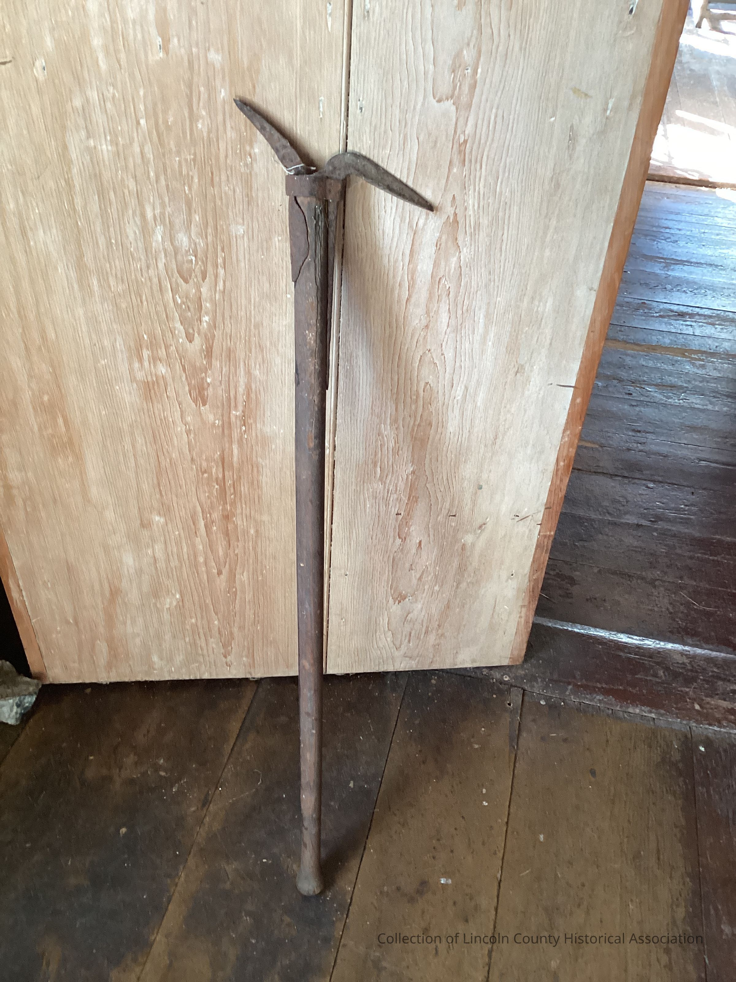Iron and wood ice pick. Two iron picks fastened to the handle within an iron band. Knotted handle.Made/Created