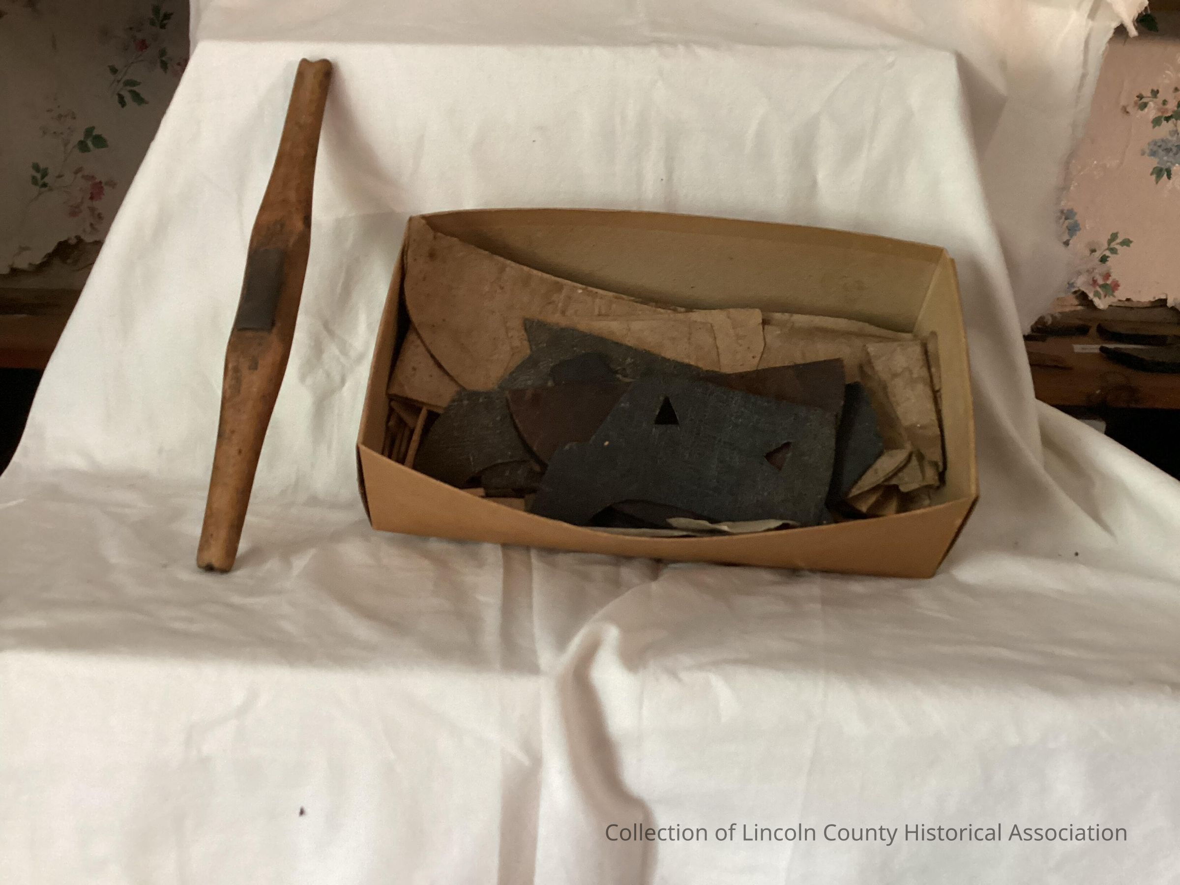 Small box containing numerous paper and leather patterns for shoe making plus pegs and a knife with a wooden handle for cutting leather. Knife made from an old file. Wet stone mounted on a maple handleMade/Created