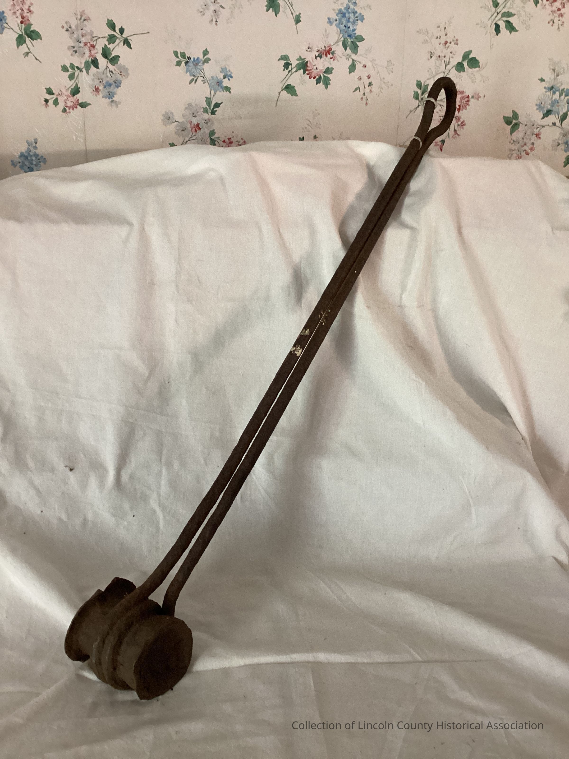 Heavy wrought iron rounding or riveting tool. Round head with a concave indentation . One side encircled by a long, twisted iron handle doubled over the head.Made/Created