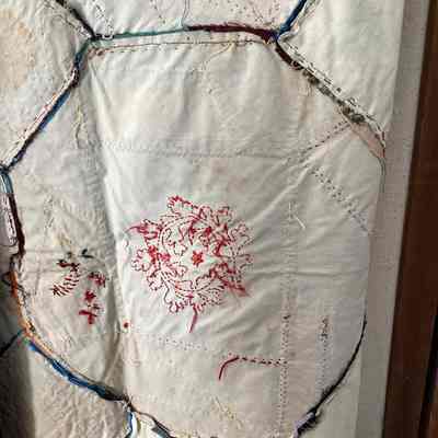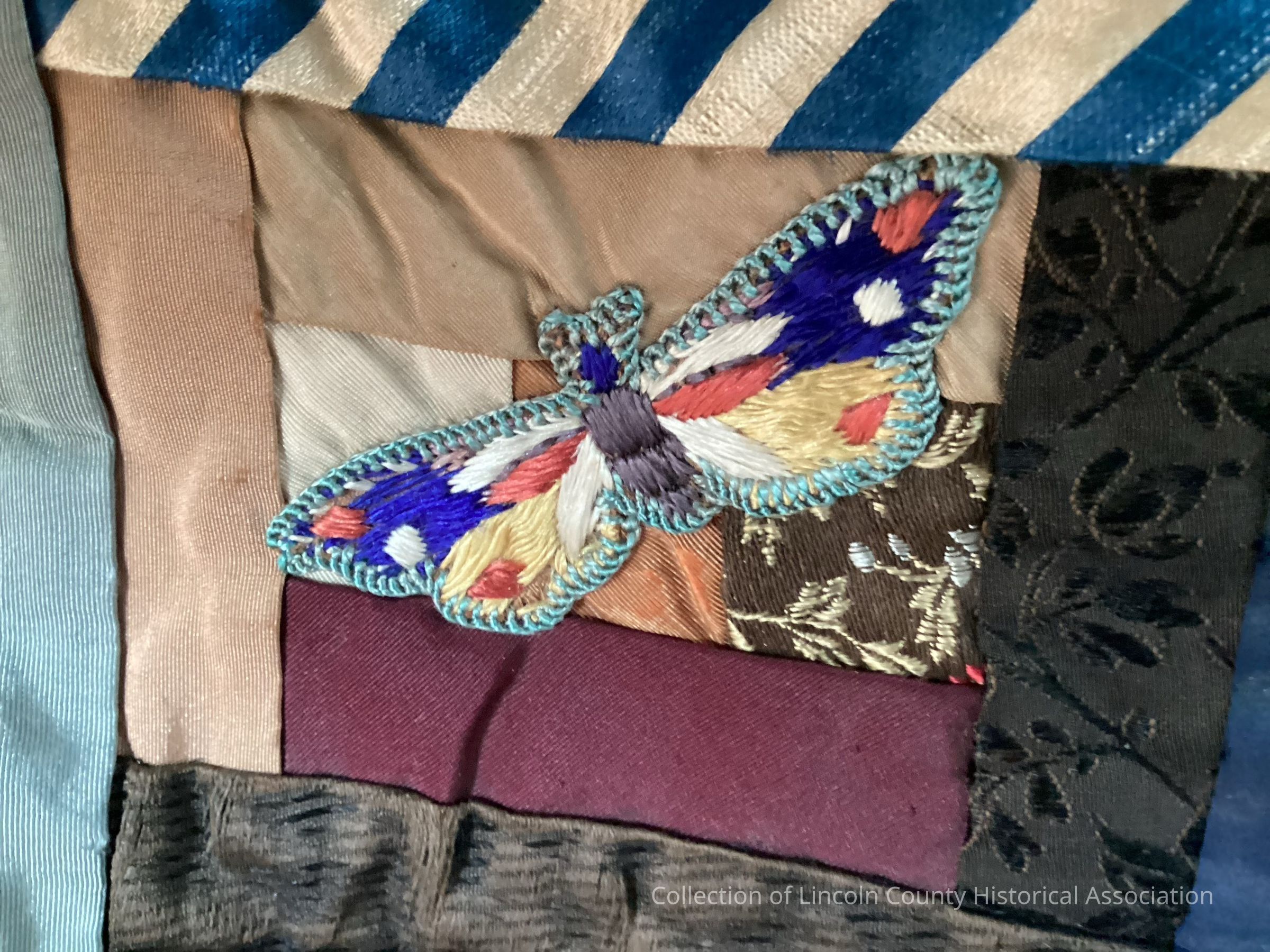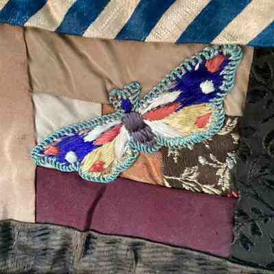 Beautiful “Crazy Quilt” with many detailed hand embroidered flowers, butterflies, and 2 crosses. Quilt top is all silk scrap pieces. Feather stitch embroidery on connecting seams. Backing is plain muslin.Made/Created