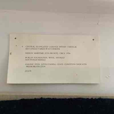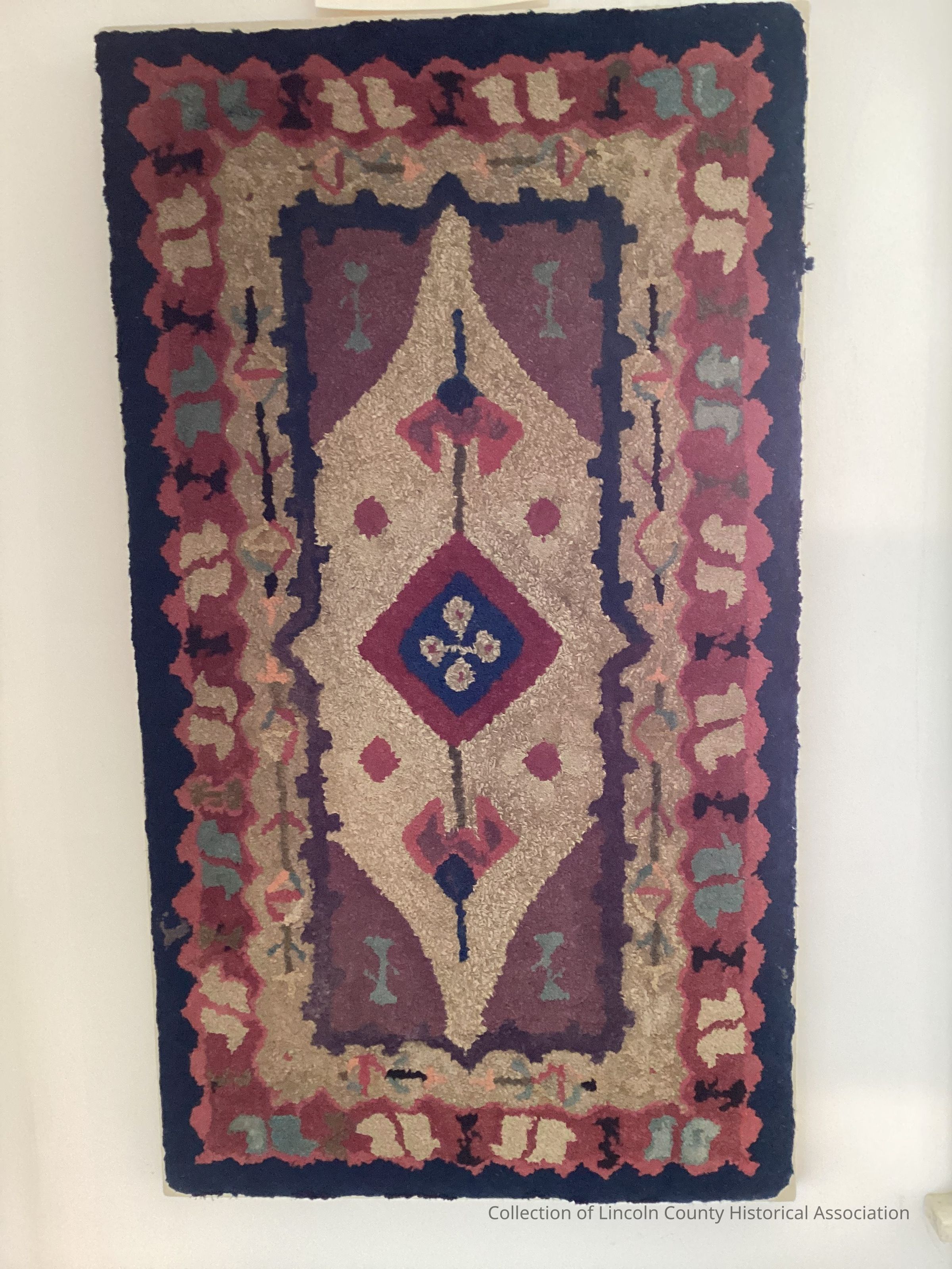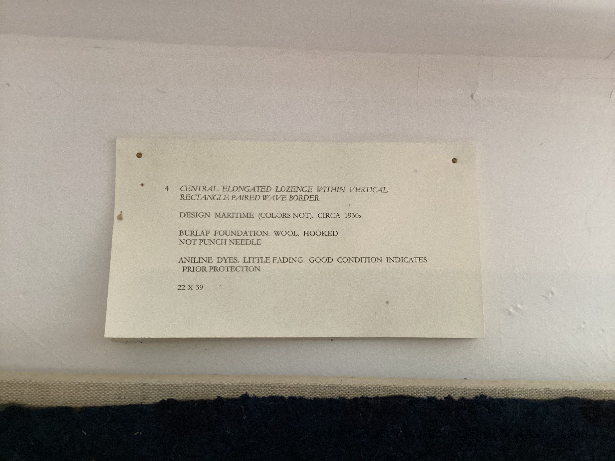 Rectangular hooked rug. Central elongated lozenge within vertical rectangle and wave border. Maritime design. Burlap back, wool yarn. Aniline dyes. Red, white, green, and black in color.Made/Created