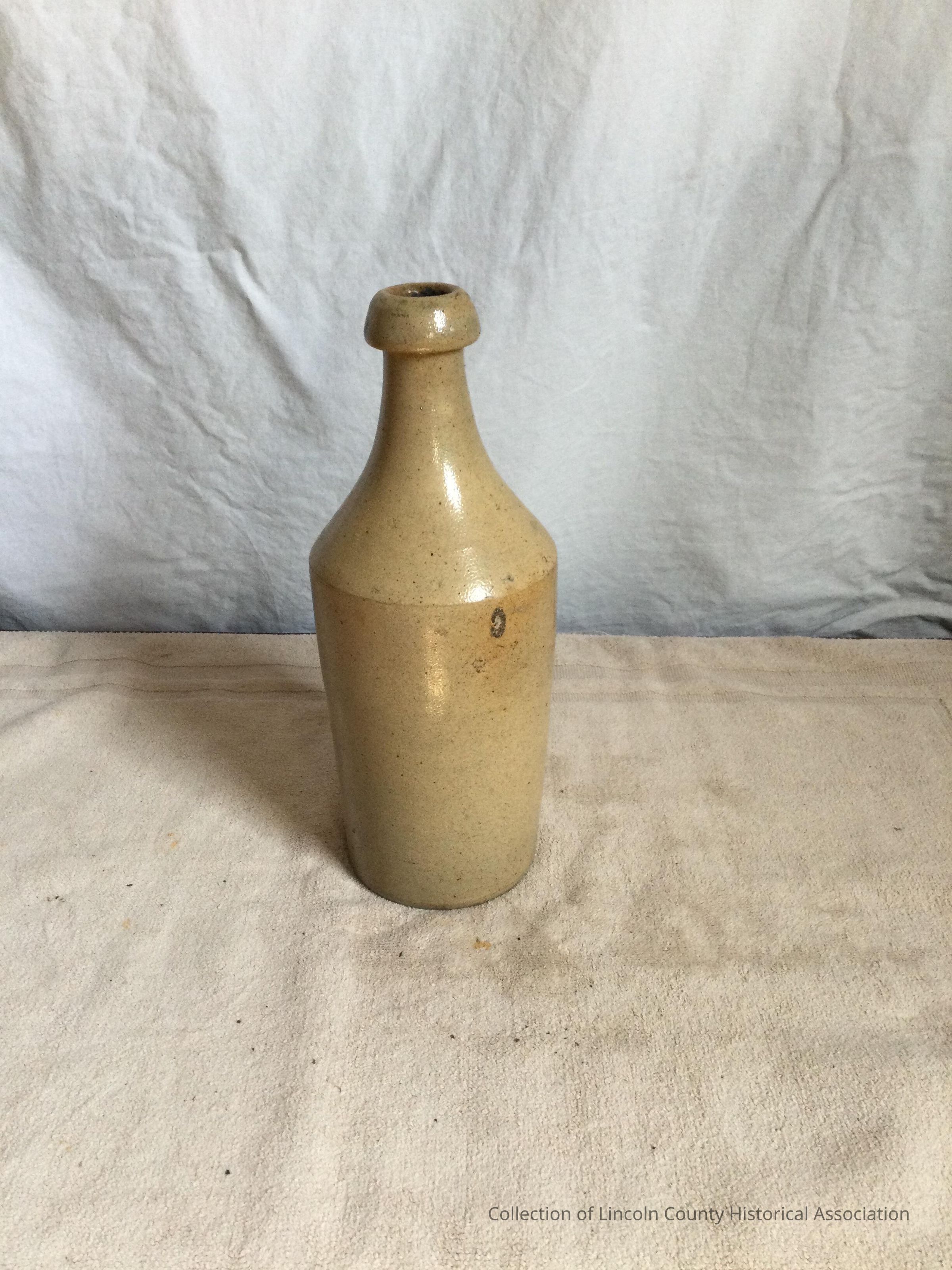 One quart stoneware bottle. Cylindrical shape and with a light brown glaze. Has a heavy lip (folded over)Made/Created