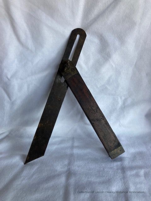 Carpenter's sliding bevel. Wooden handle (likely made of mahogany). Capped at ends with brass fittings. Is slotted in order to hold the moveable blade which can be adjusted at the rounded end both in terms of angle and extension.