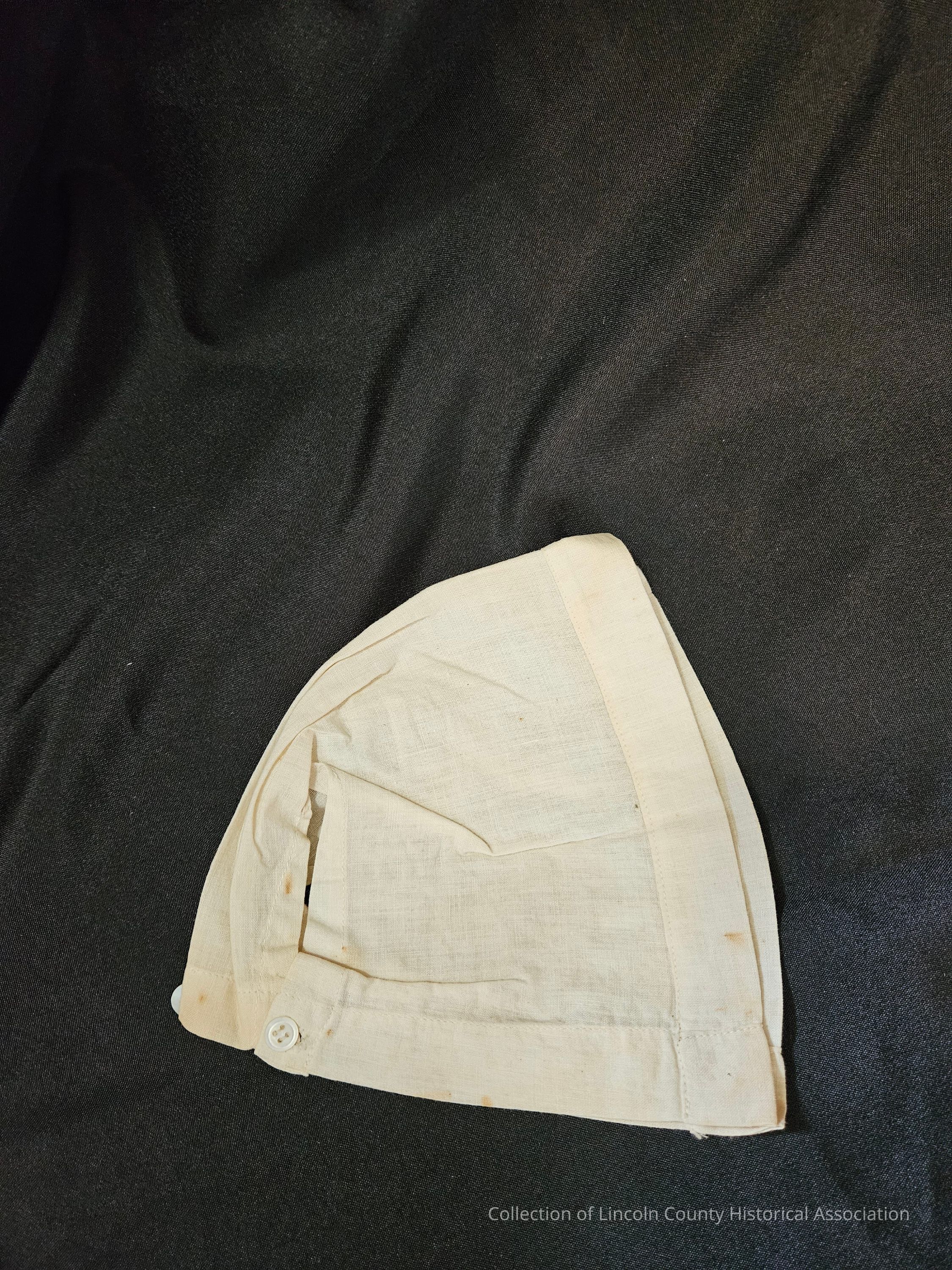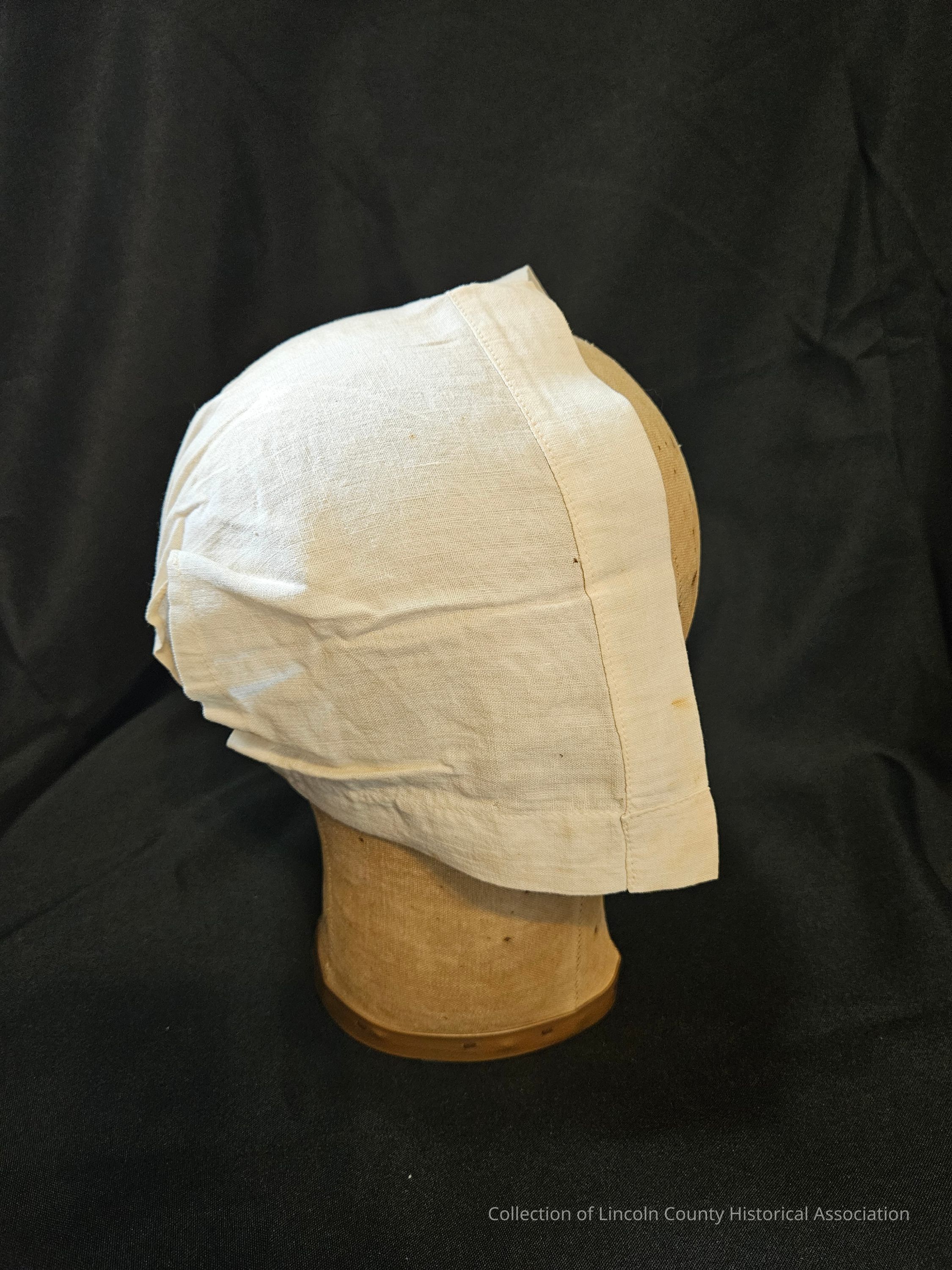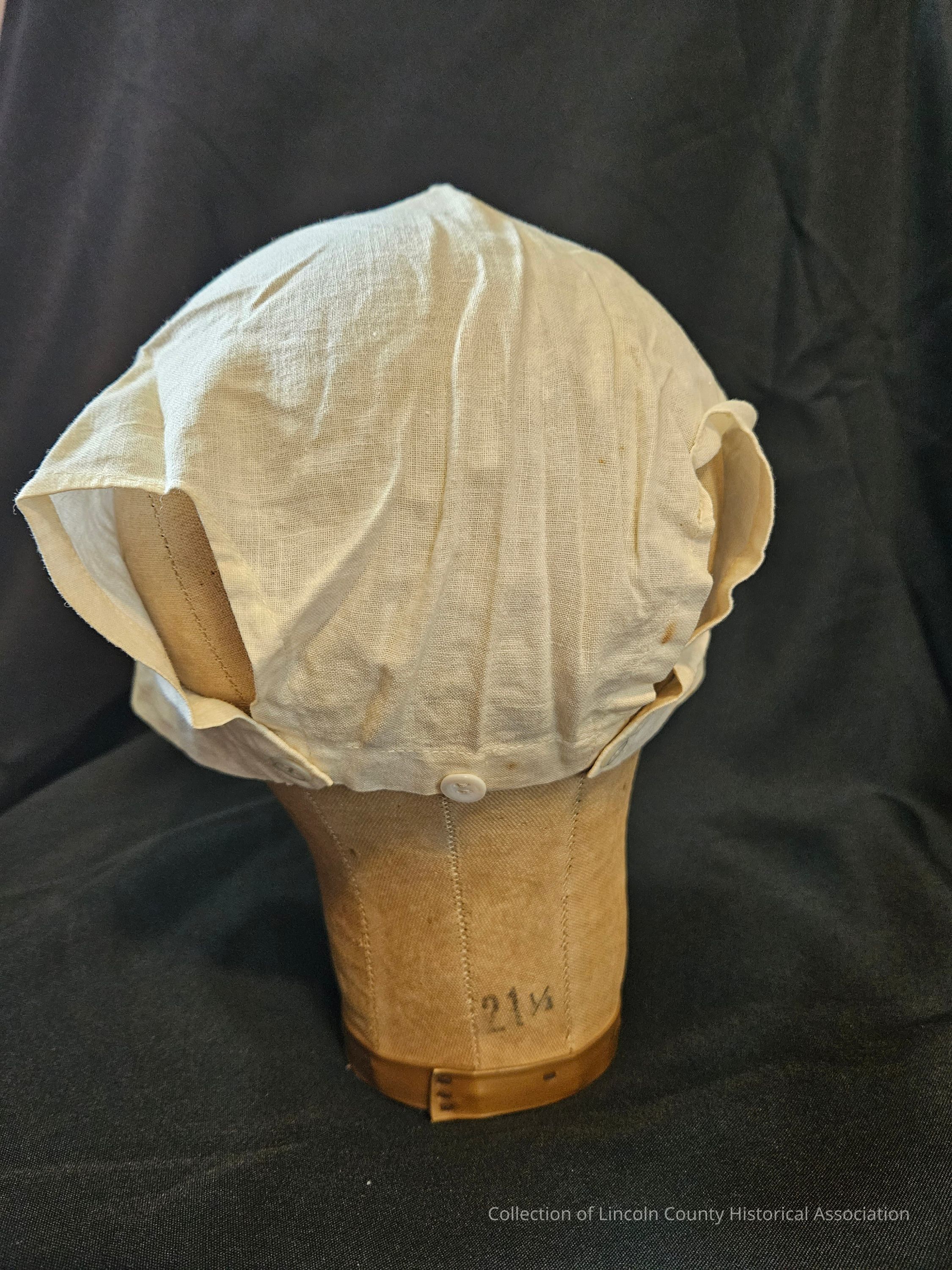 Plain cotton cap. Machine stitched. Two holes in back with two buttons. Edges double layered fabric.Clothing/Dress/Costume Details
