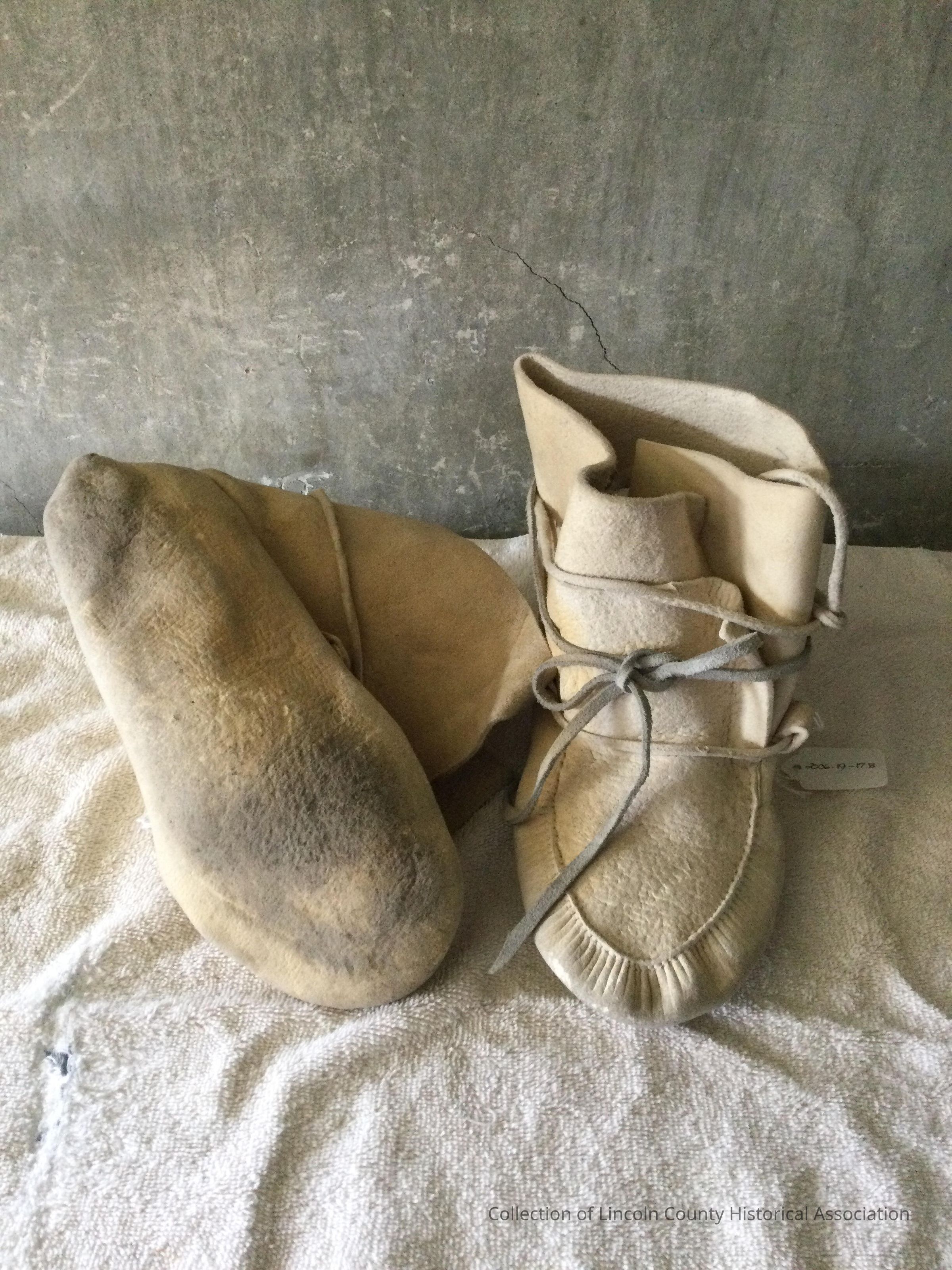 Pair of Native American hide moccasins for winter use with leather laces. Undecorated.