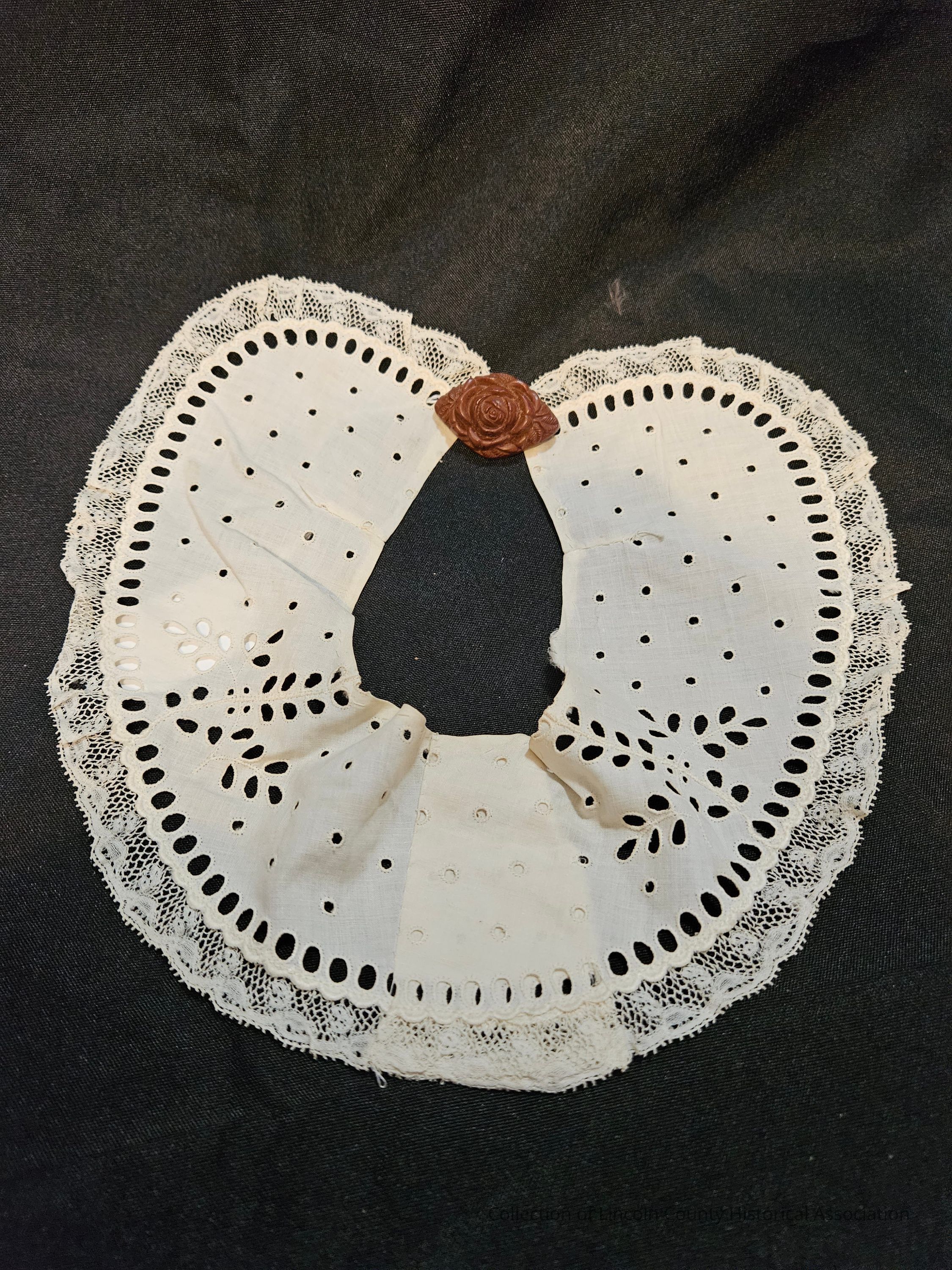 Women's cotton collar with leaf and dot design. Lace edging. Brown rose shaped pin.Clothing/Dress/Costume Details