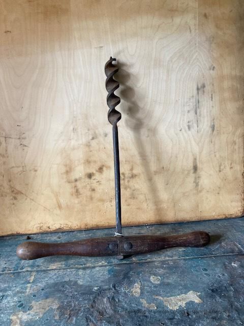 Iron spiral/twist bit auger with a turned wooden handle. The bit is bolted through the wooden handle. With five spirals.