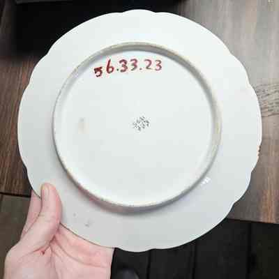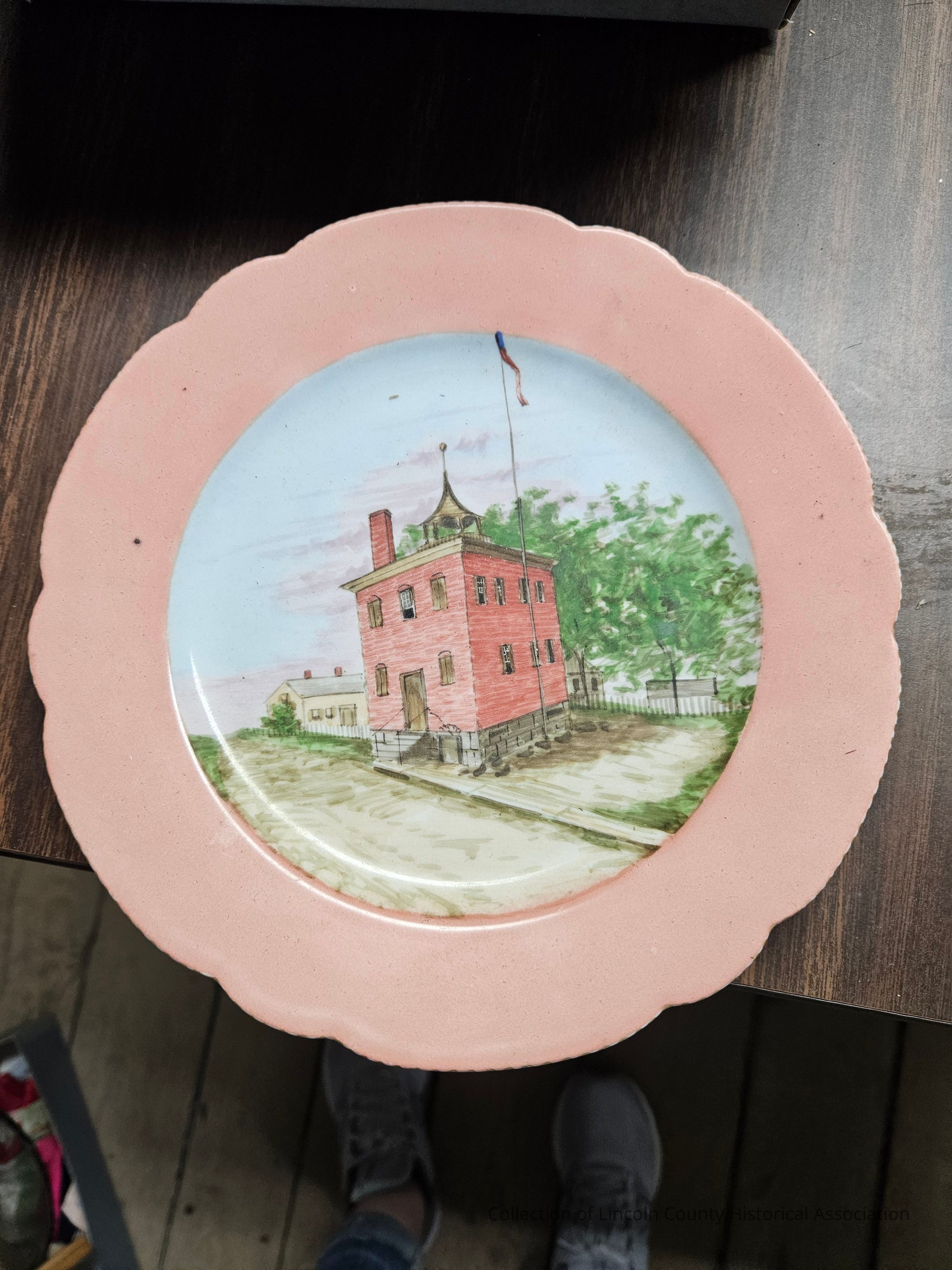 China plate painted by Elizabeth P. Patterson. Image is of Wiscasset Academy. Edge is scalloped and pink in color.