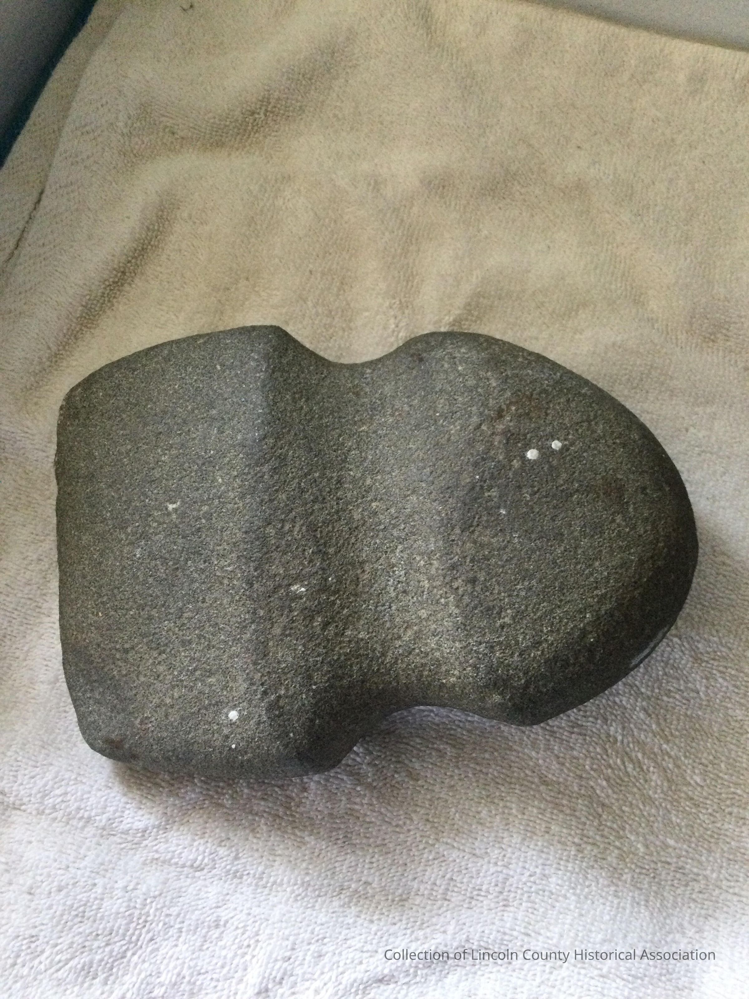Native American stone axe head with a grooved waist, presumably for a thong securing a wooden handle. The cutting end resembles an axe head whereas the other end is rounded in an oval profile to lend impact weight.Made/Created