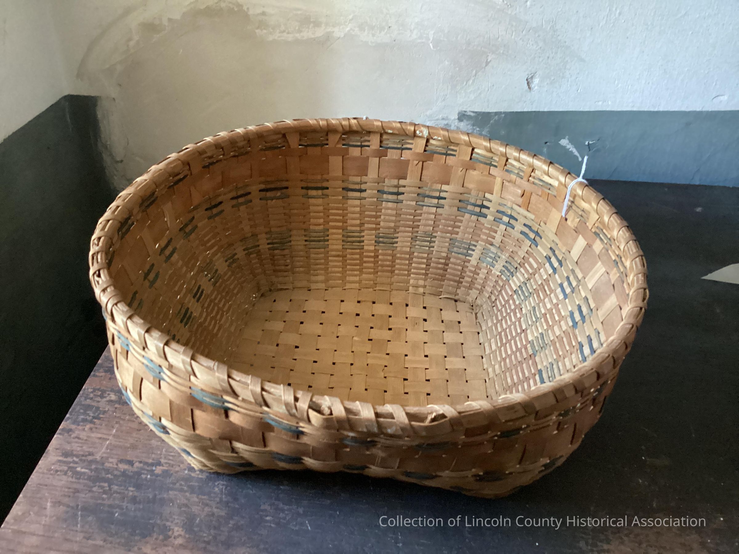 Native American splint open work basket with squared bottom and round top. Has a double rim. Made mostly of thin hardwood splints but with two wider splints near top. Certain splints colored blue.