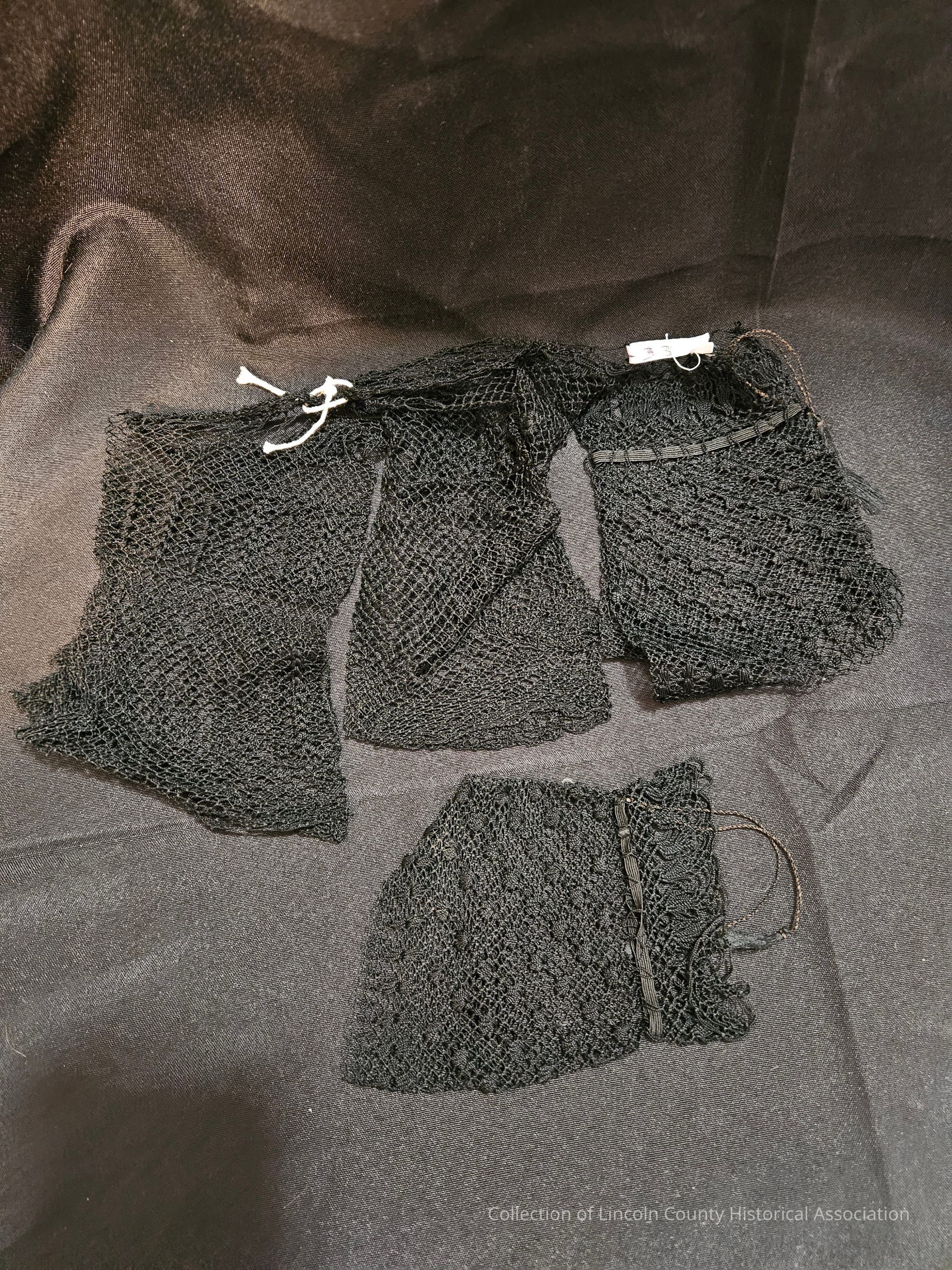 Set of four black lace wristlets. Two different pairs. One pair has dot design and is gathered at top. Also has black tassels. Other pair has line designs.