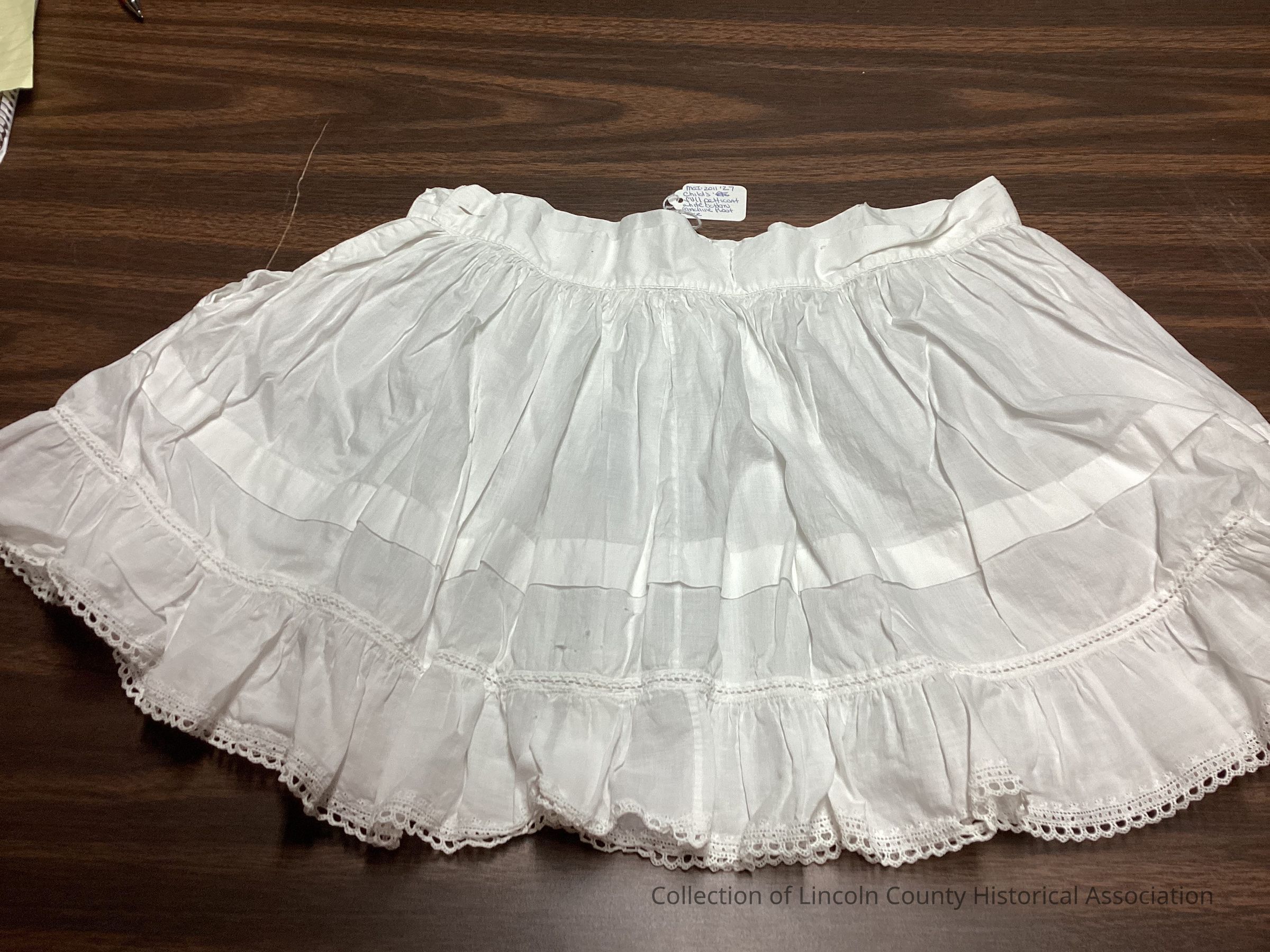 White cotton child's petticoat. One pleat. Eyelet design at hem and strip of mesh insert between pleat and hem. Button closure.Clothing/Dress/Costume Details
