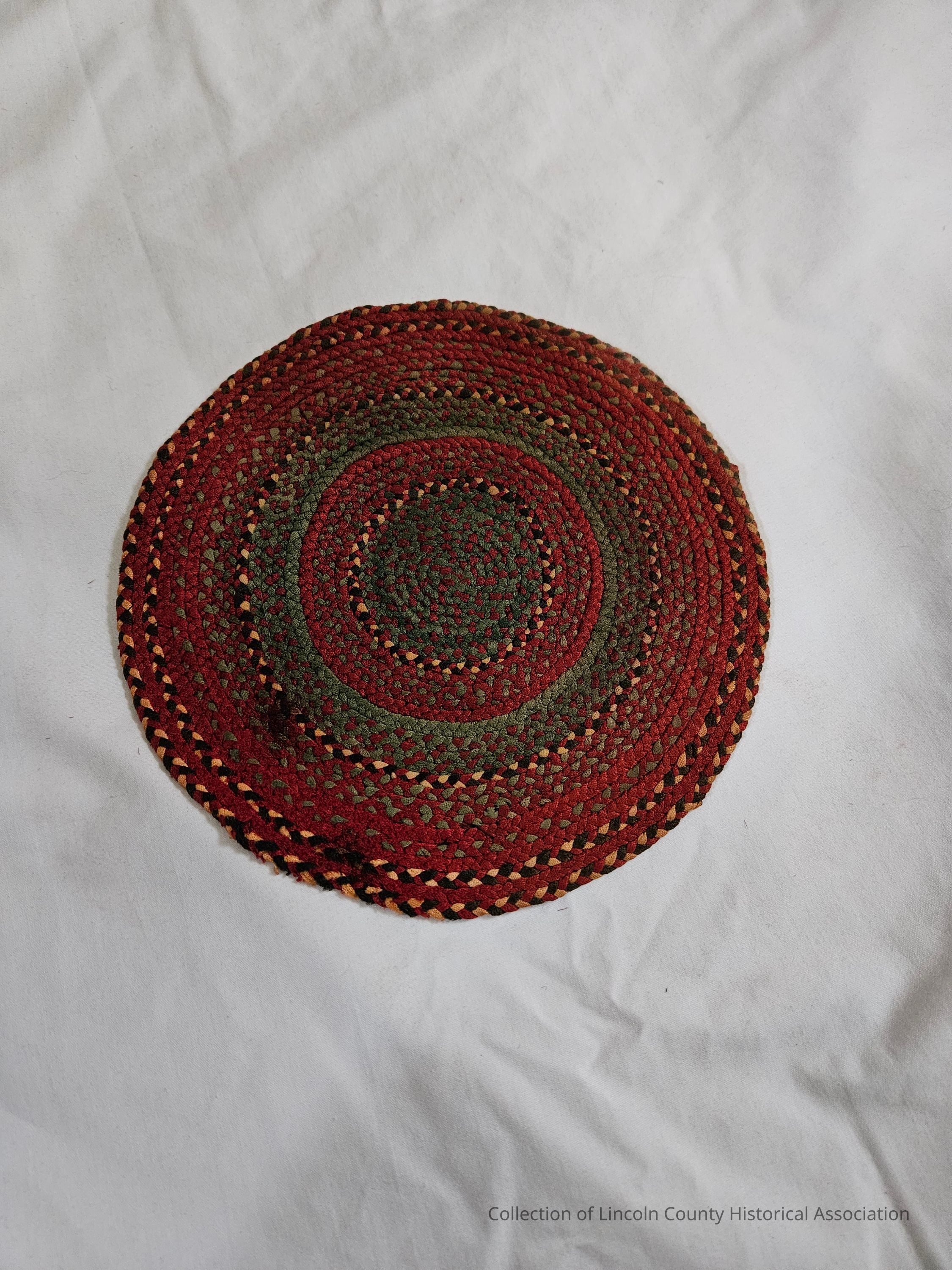 Small decorative braided rug/mat. Circular in shape with alternating circles of red and green. Bits of yellow and black throughout.Made/Created