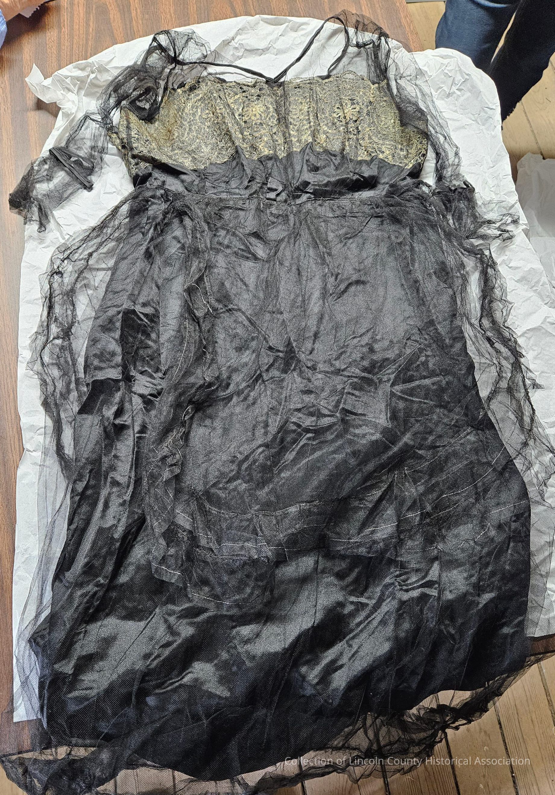 Small black silk net dress over black satin. Black silk netted "aprons" in front and back. Three-quarter length sleeves. Gold metal lace dress bodice.Clothing/Dress/Costume Details
