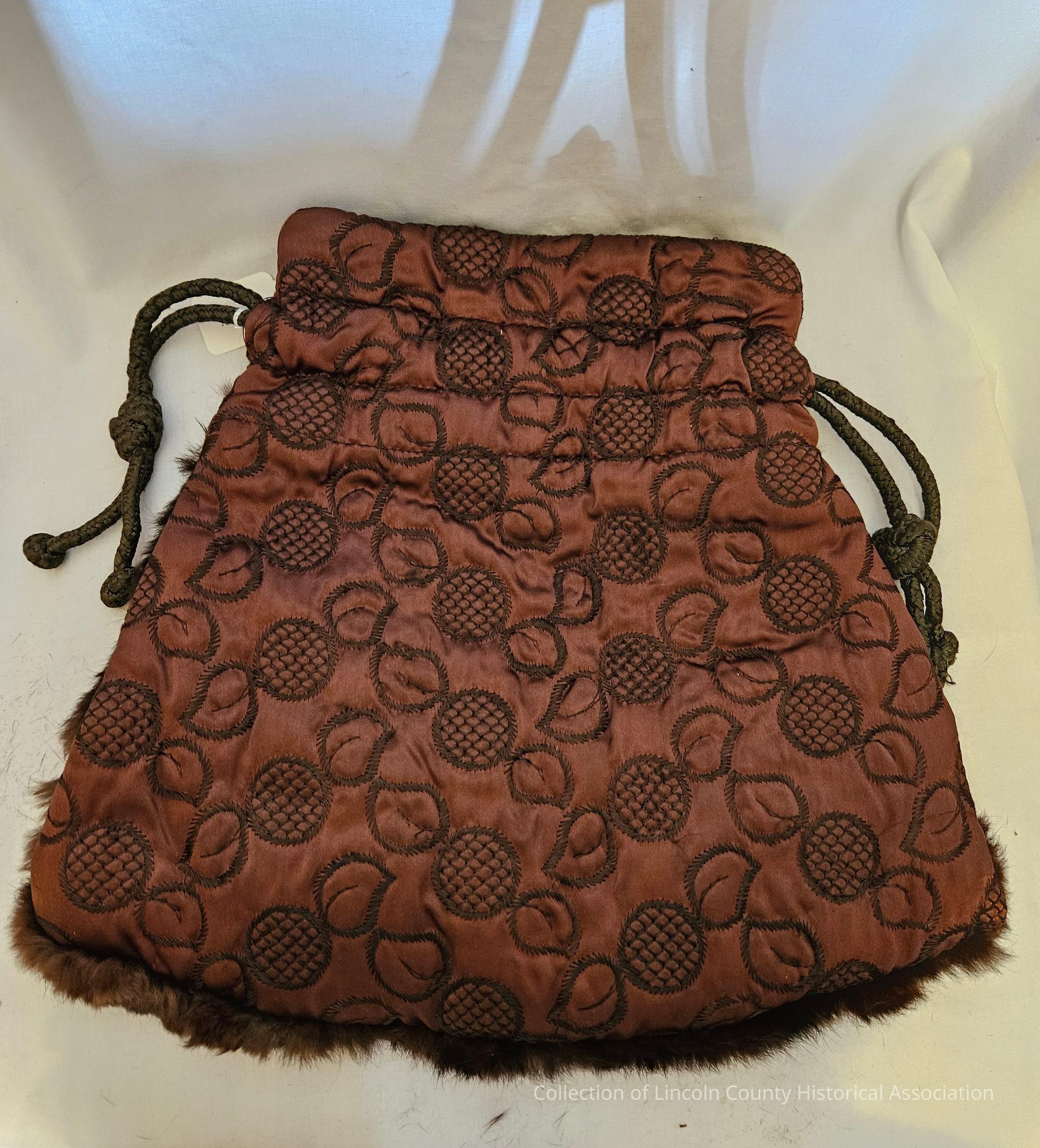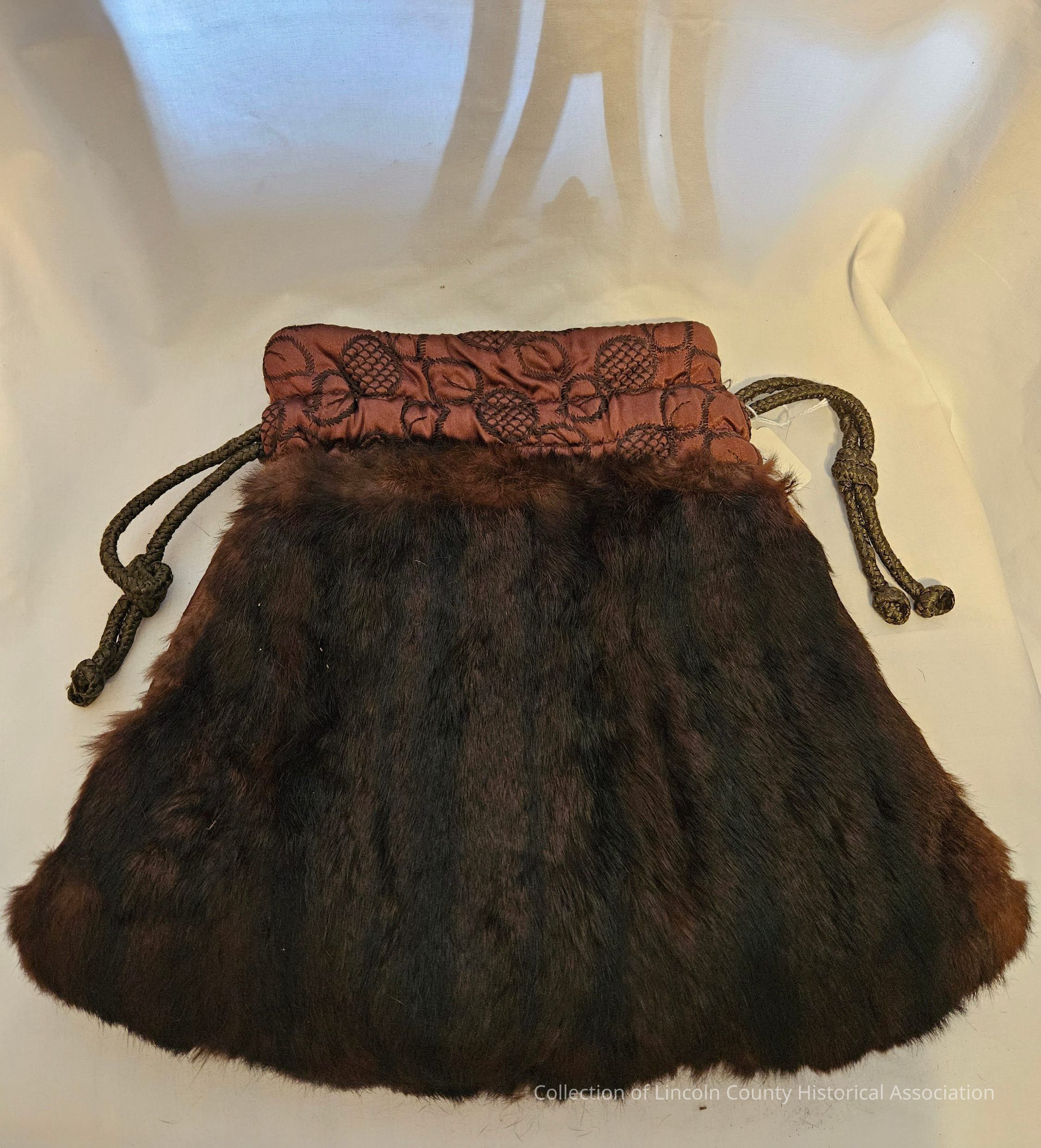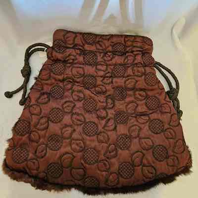 Large brown purse and muff combination. Holes in each side of purse for arms and drawstring pouch above. Top of purse and one side has thistle and leaf designs. Other side of the purse is covered in mink fur.Made/Created