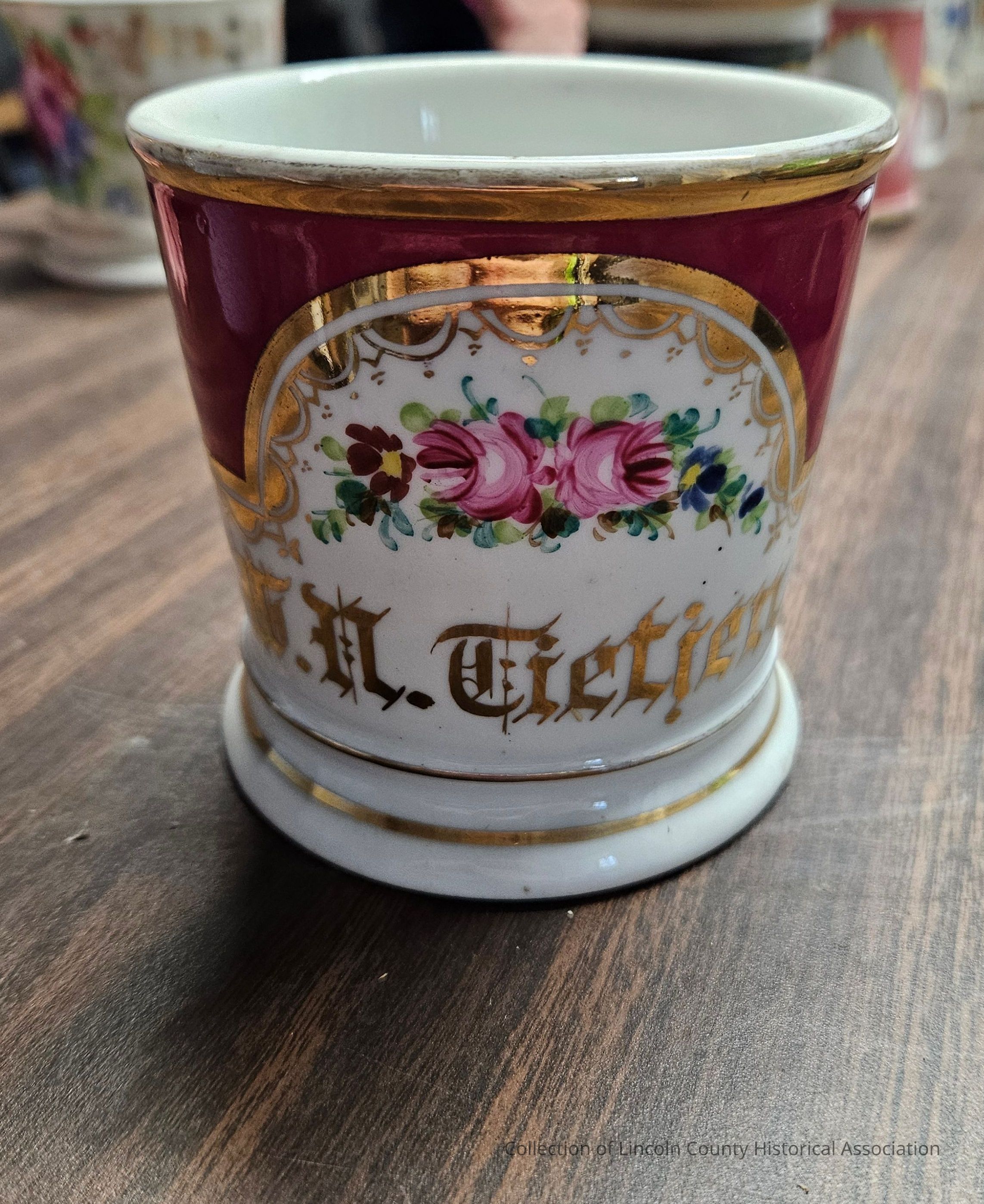 Shaving mug. Red in color with gold trim. Floral design in center with gold lettering reading "W.M. Lietiett"