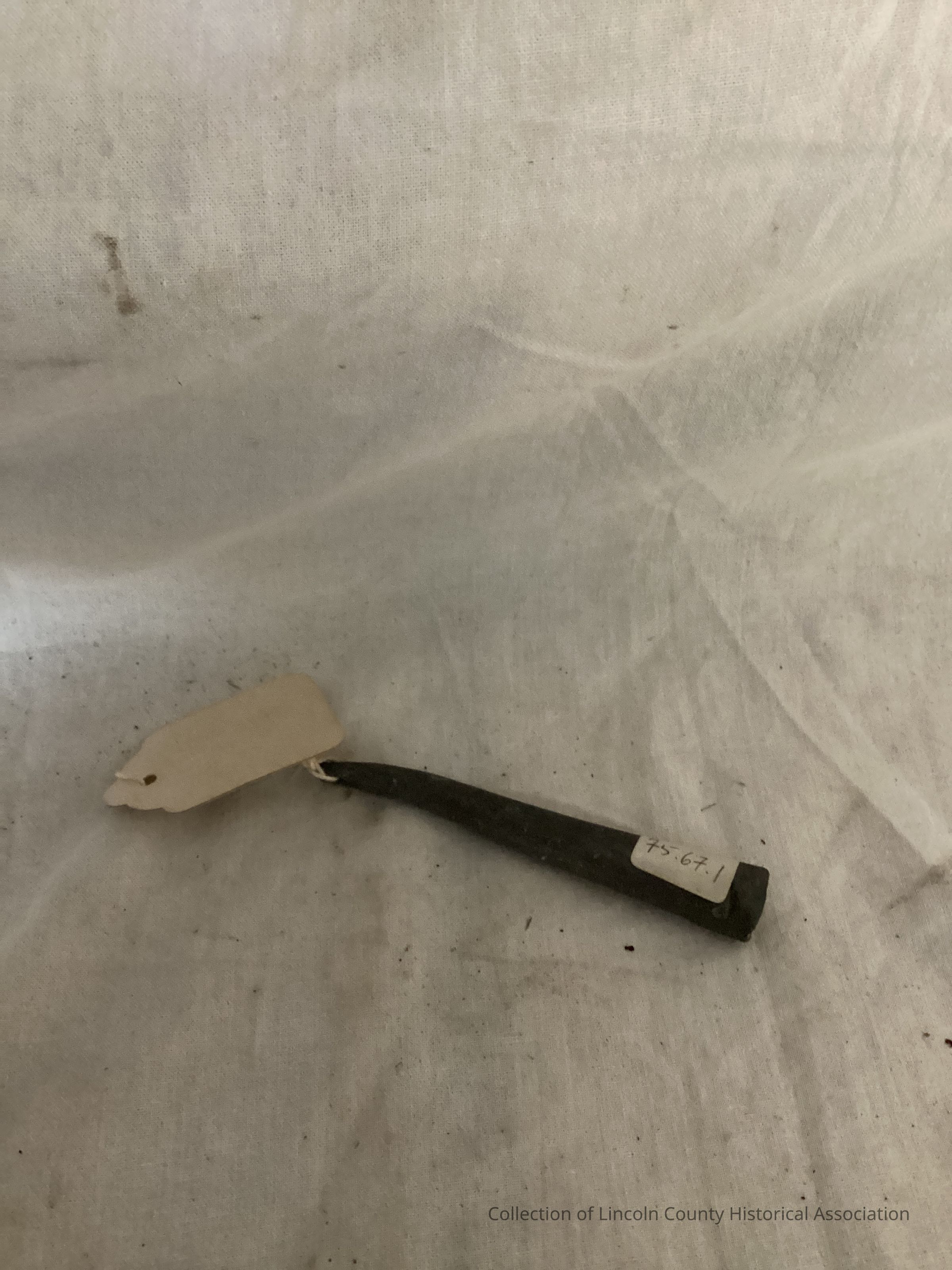 Lead fishing sinker. Hole in small top end and an angled hole in the flattened base.Made/Created