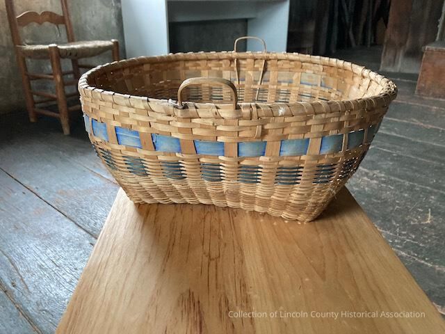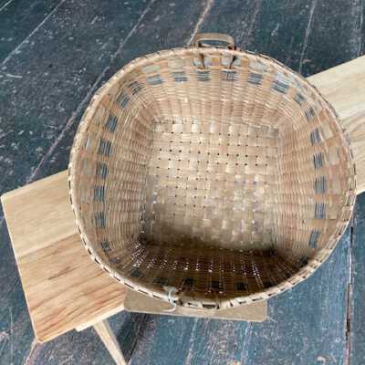 Native American circular splint open work basket with single wide and five narrow splint bands colored blue. Base is square but top is a circular. With handles that are notched to keep them in place. Also with traces of white and red splints towards the base of the basket.Made/Created