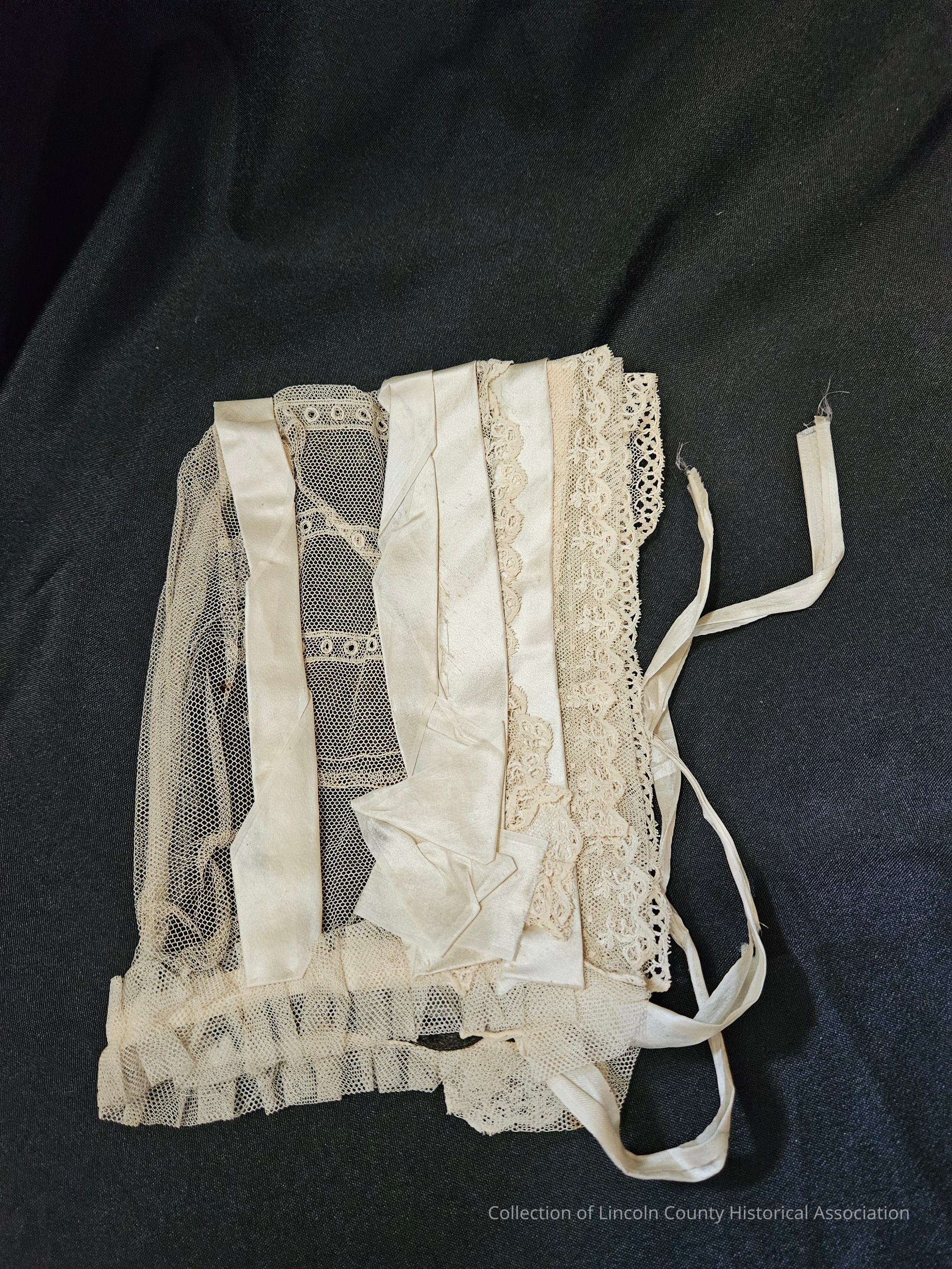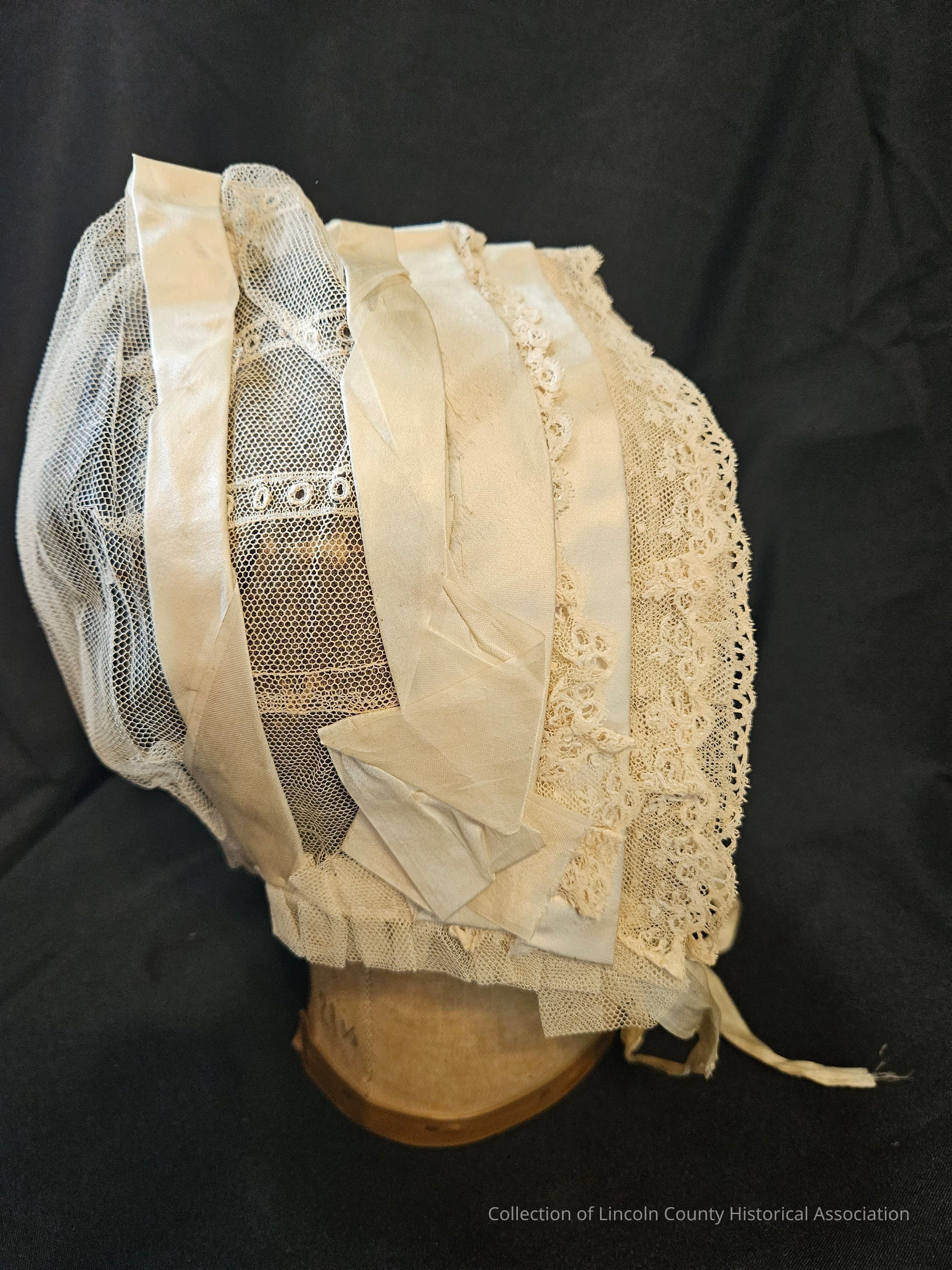 Hand stitched white netting and lace woman's cap. Silk ribbons edging front of cap and one along the back. Scalloped lace and ruffled netting also along the edge of cap. Black organza lining the inside of the cap. Two thin silk ties.Clothing/Dress/Costume Details