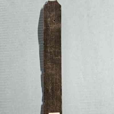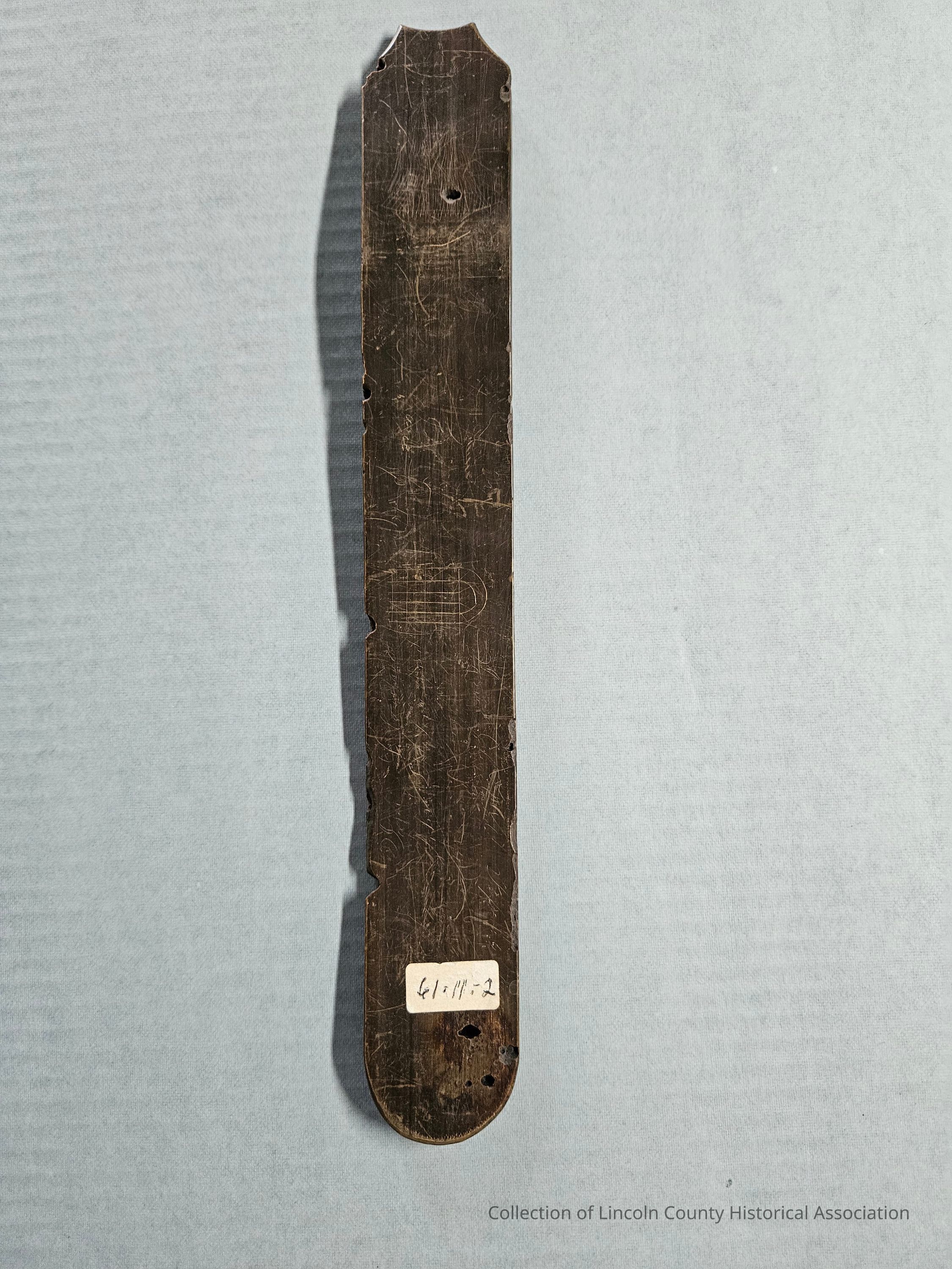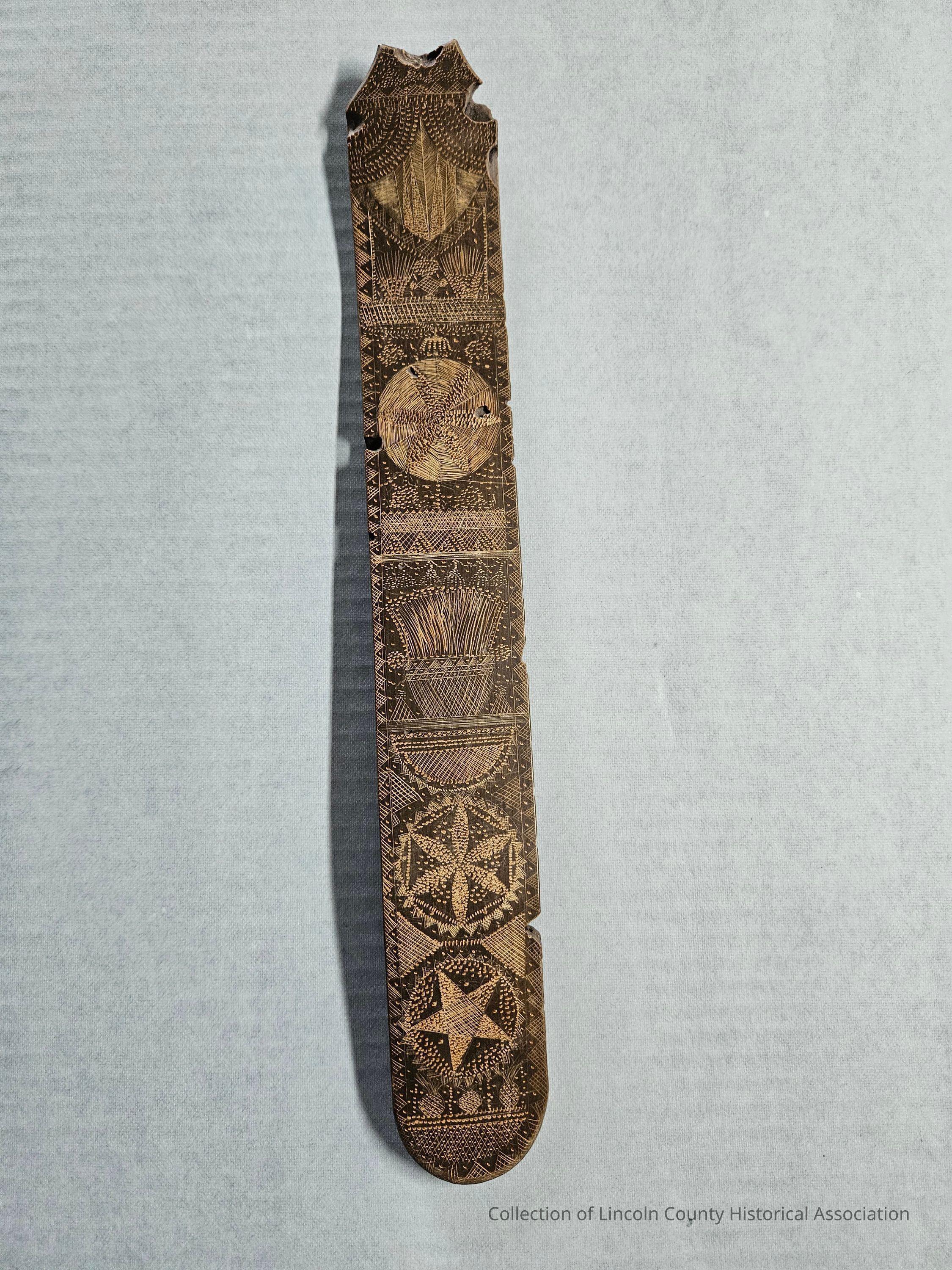 Baleen busk. Intricately etched with a series of panels depicting thistles below a curtain, a circle with a star, a vase with flowers, and another circle with a star. Also three pineapples. The back has a sketch of a sailor ship with three masts. Also signature of Jane A. Cleveland followed by the date September 5, 1819.Made/Created