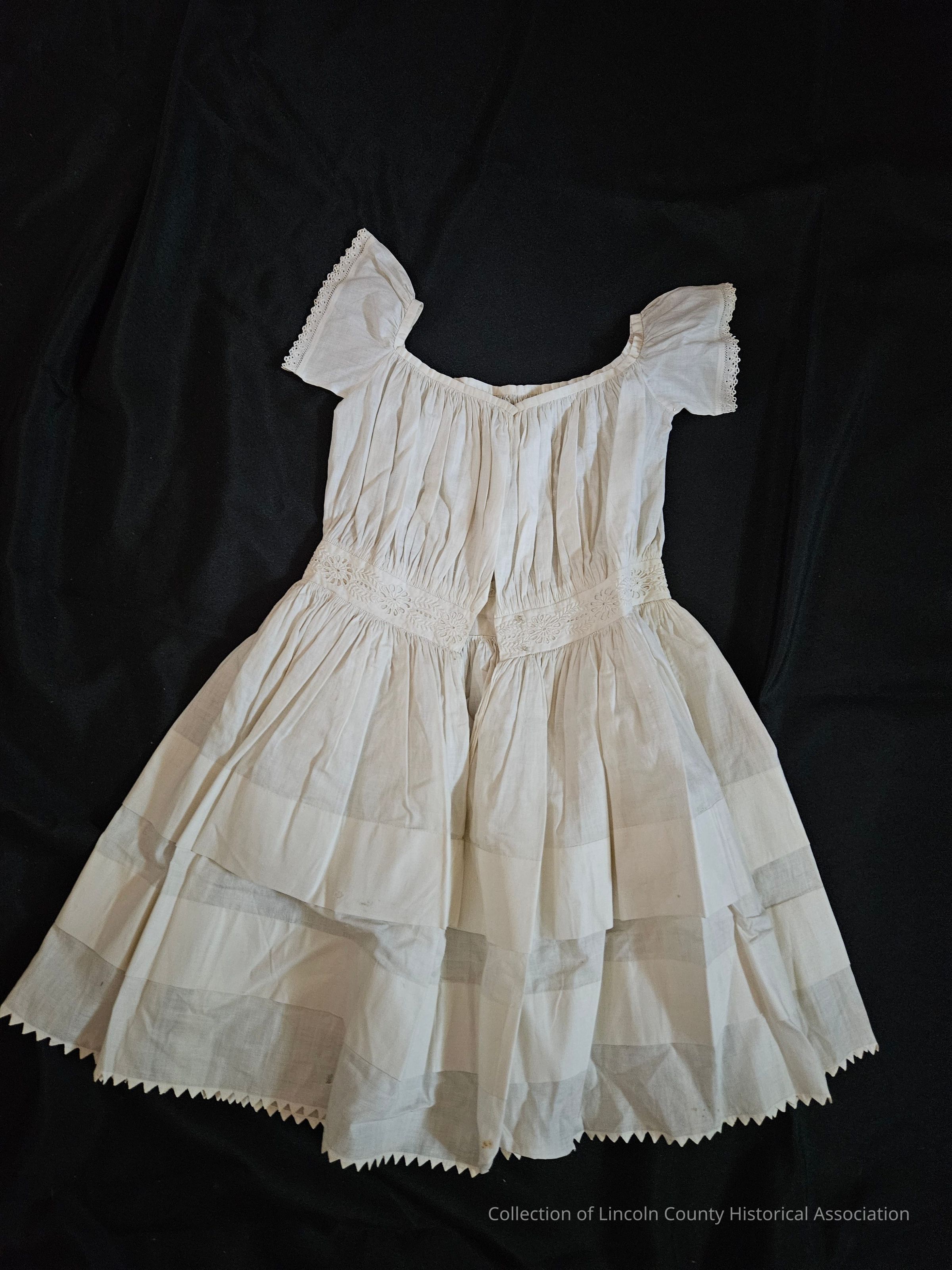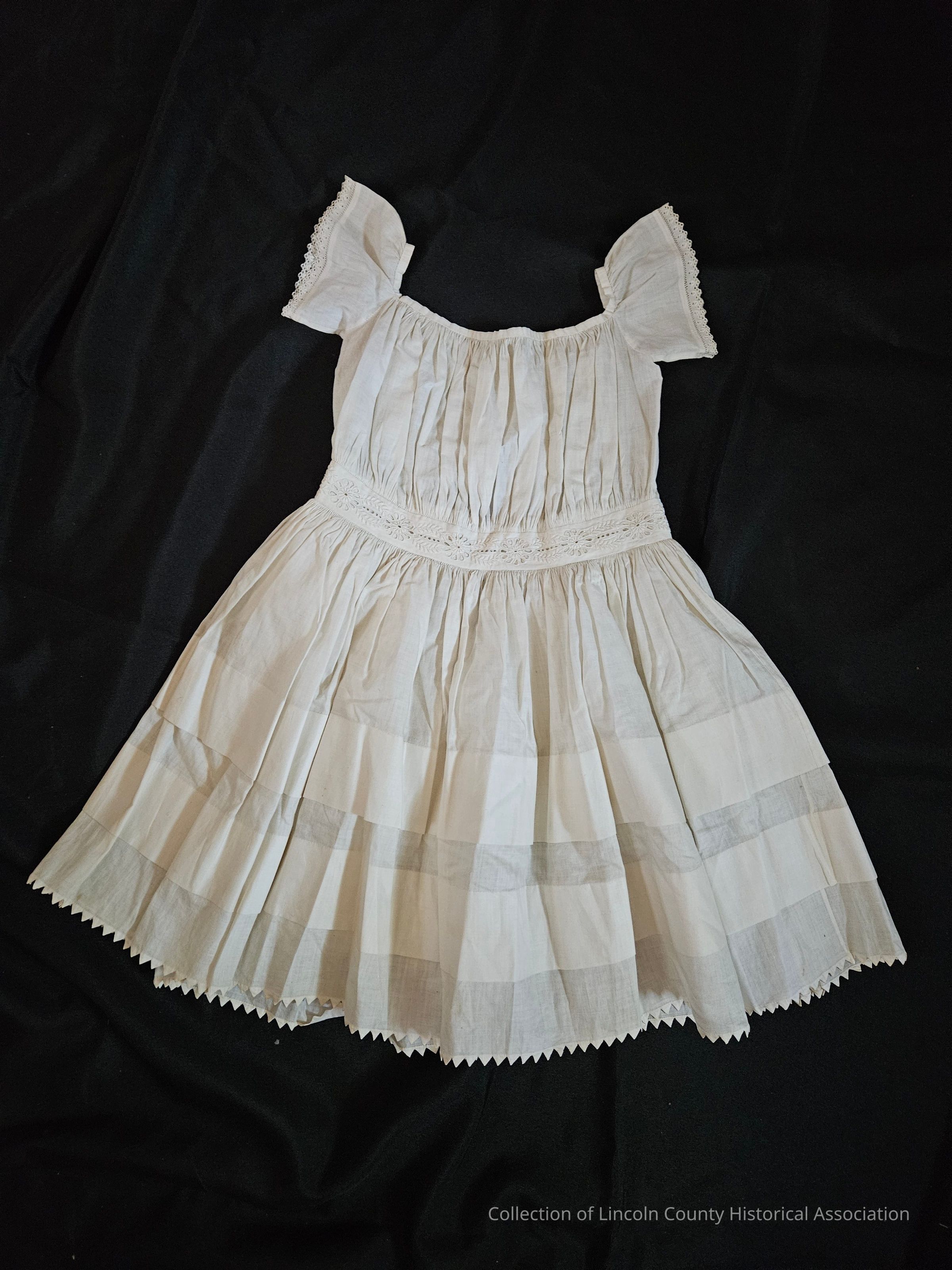 White child's dress with prairie point edge on bottom. Hand stitched. Two large pleats on skirt. Floral embroidery around waist. Small scalloped embroidery on sleeves.Clothing/Dress/Costume Details
