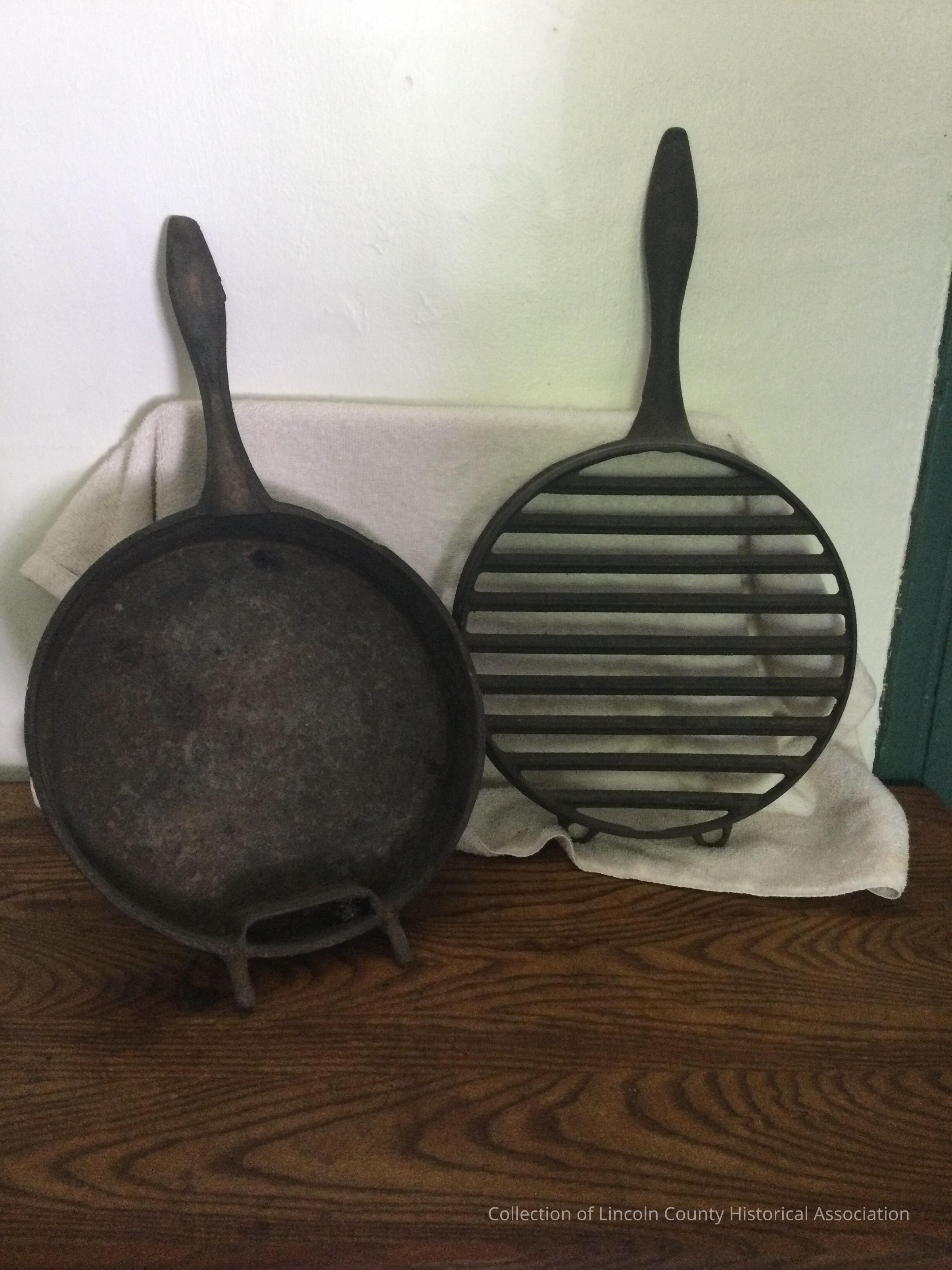 Cast iron broiler and grill each with a handle that tapers, swells, and tapers to a point. The grill hooks onto the pan.Made/Created