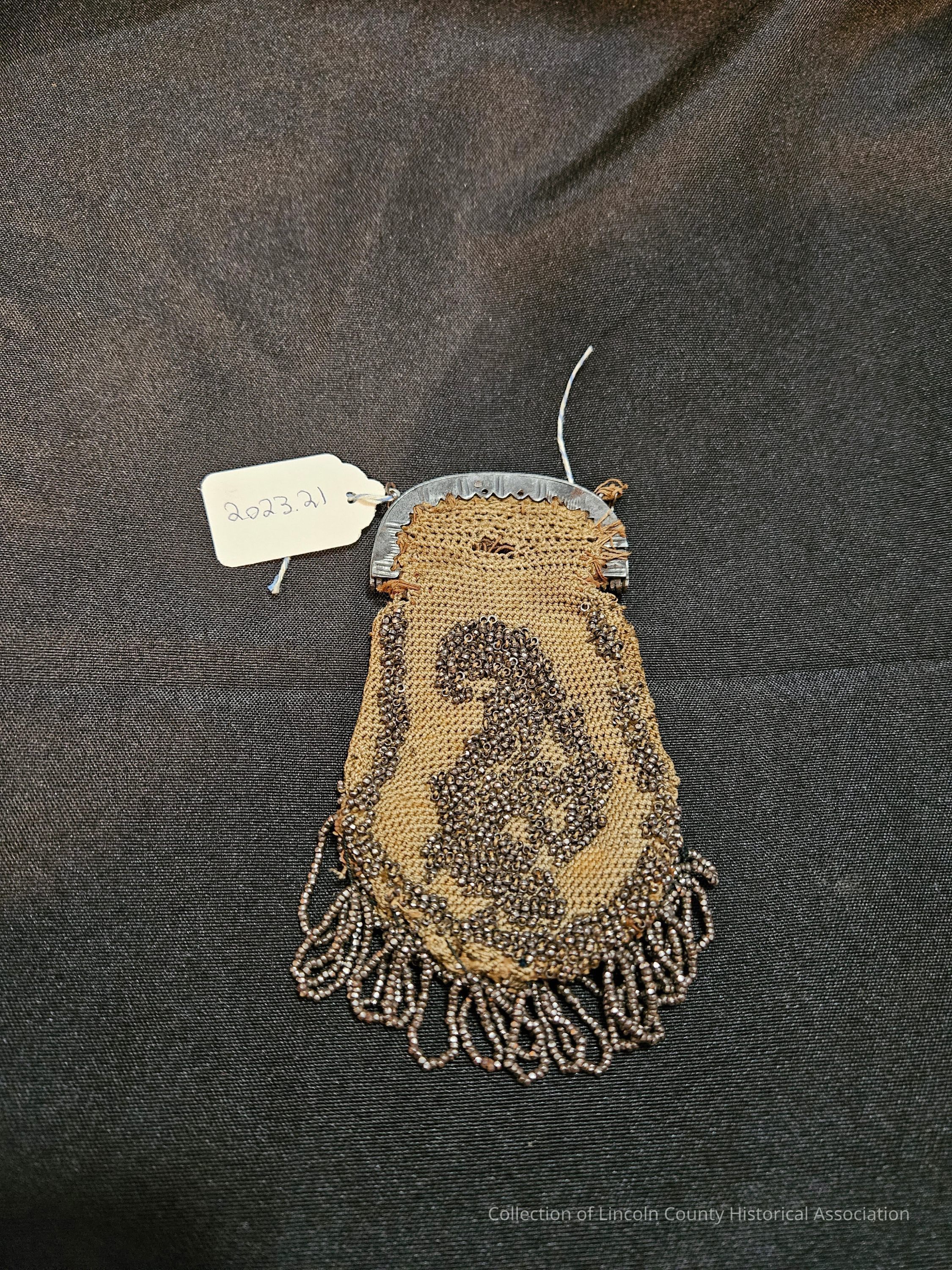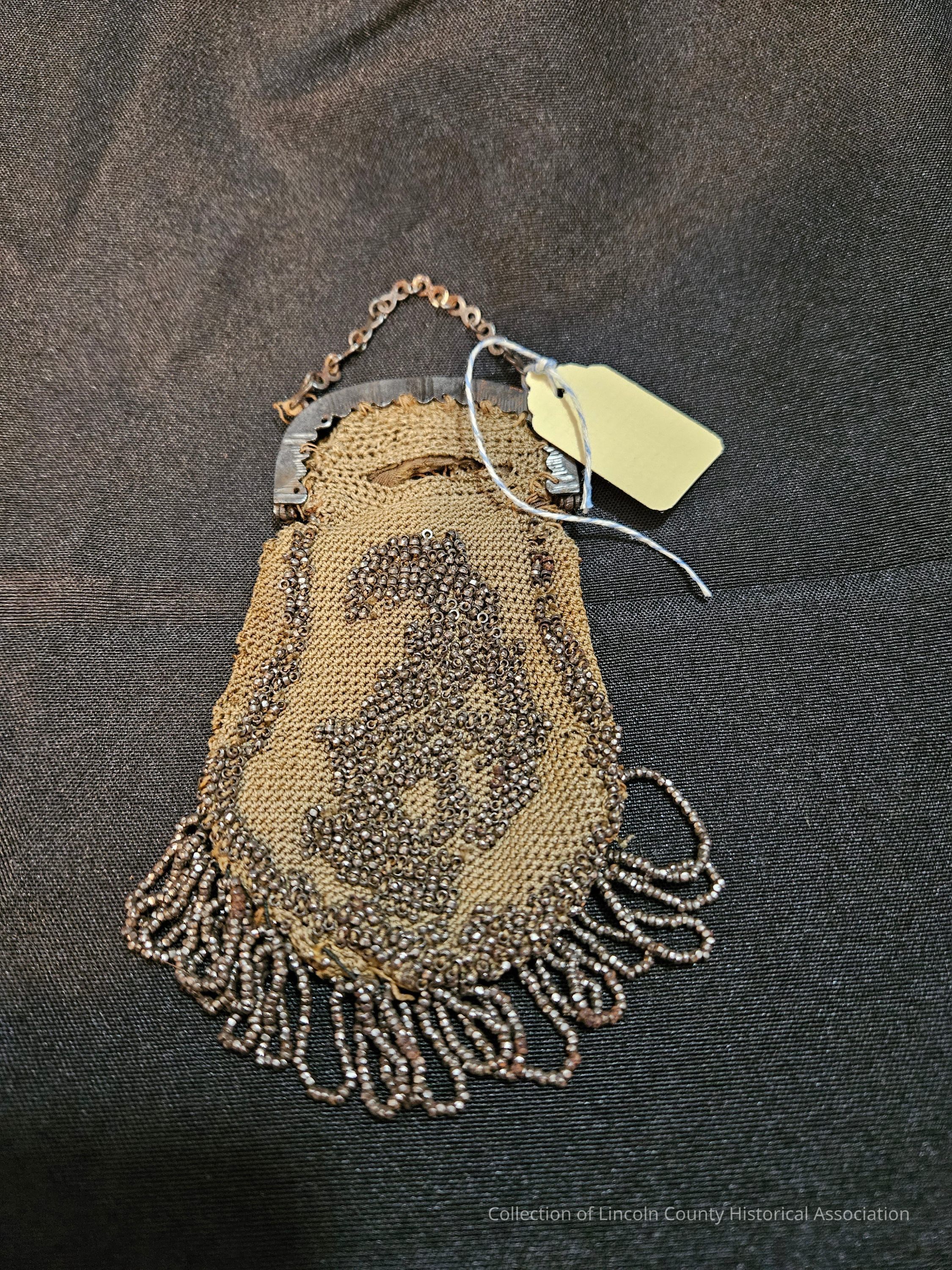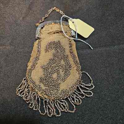Small beaded reticule. Brown fabric with silver beads in the center and around the edges. Beaded loops on the end of the bag and metal clasp at top. Small chain handle. Back and front are the same.