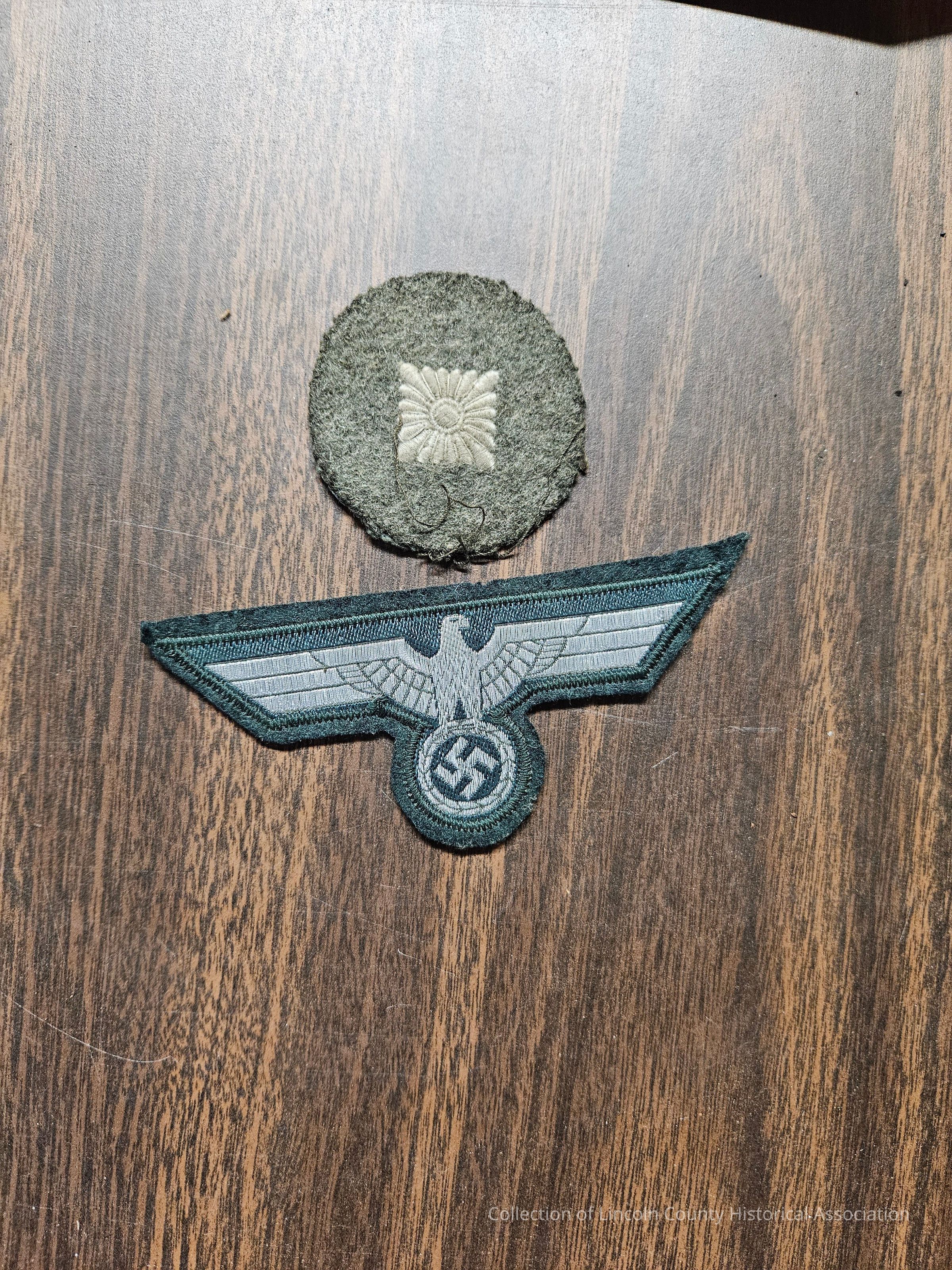Two German World War II cloth patches. Green in color. One has Nazi eagle. Other is circular with a diamond like shape in the middle. This patch is an Oberschutze patch. While having no direct equivalent, Oberschutze is generally regarded as comparable to a Private First Class. These patches were likely brought home by US Army veteran Staff Sergeant Daniel S. Pratt III, who served in the 9th Infantry Division.Made/Created