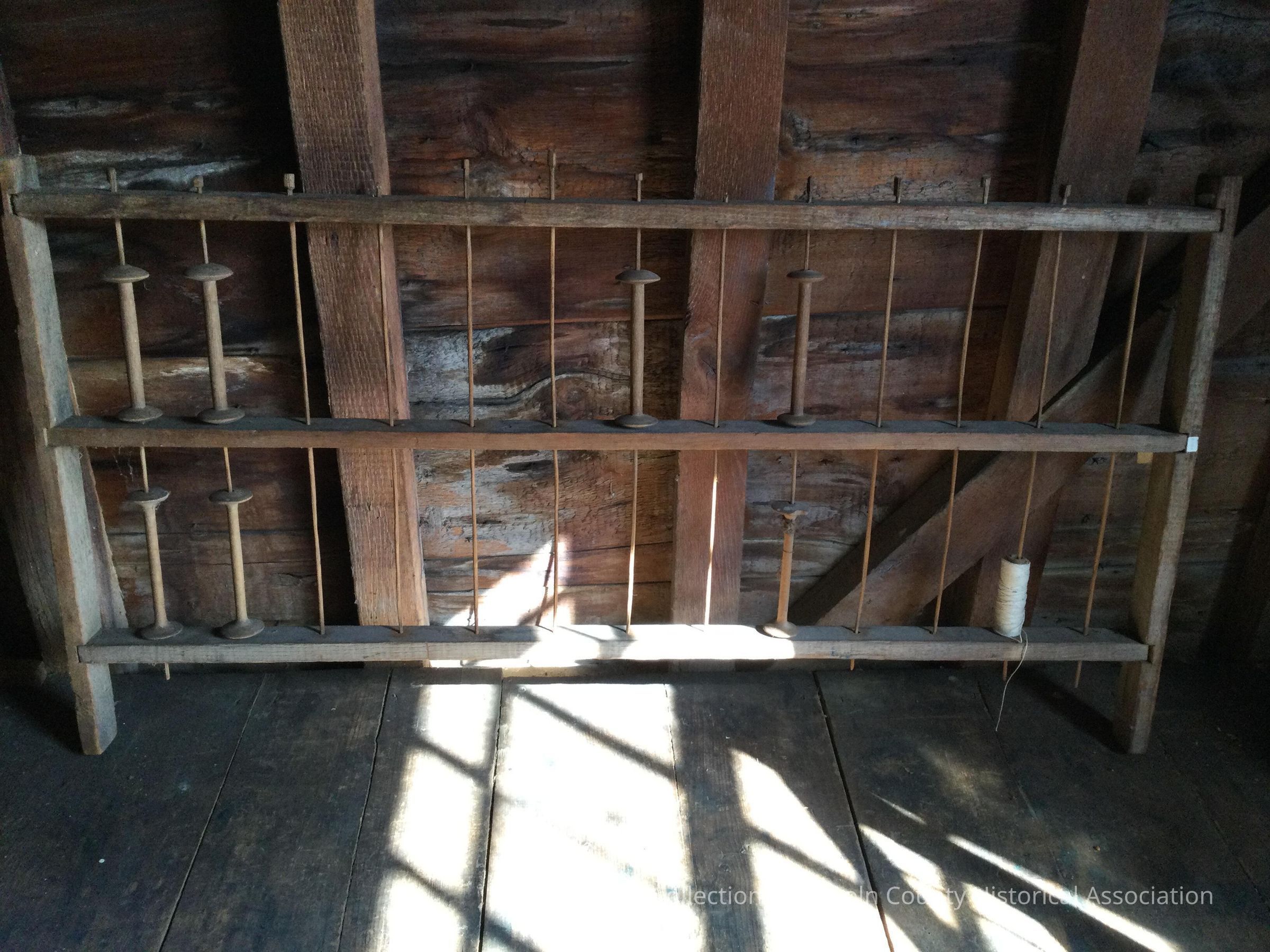 Wood and metal spool rack. Long frame with two rows of wire to hold spools for warping