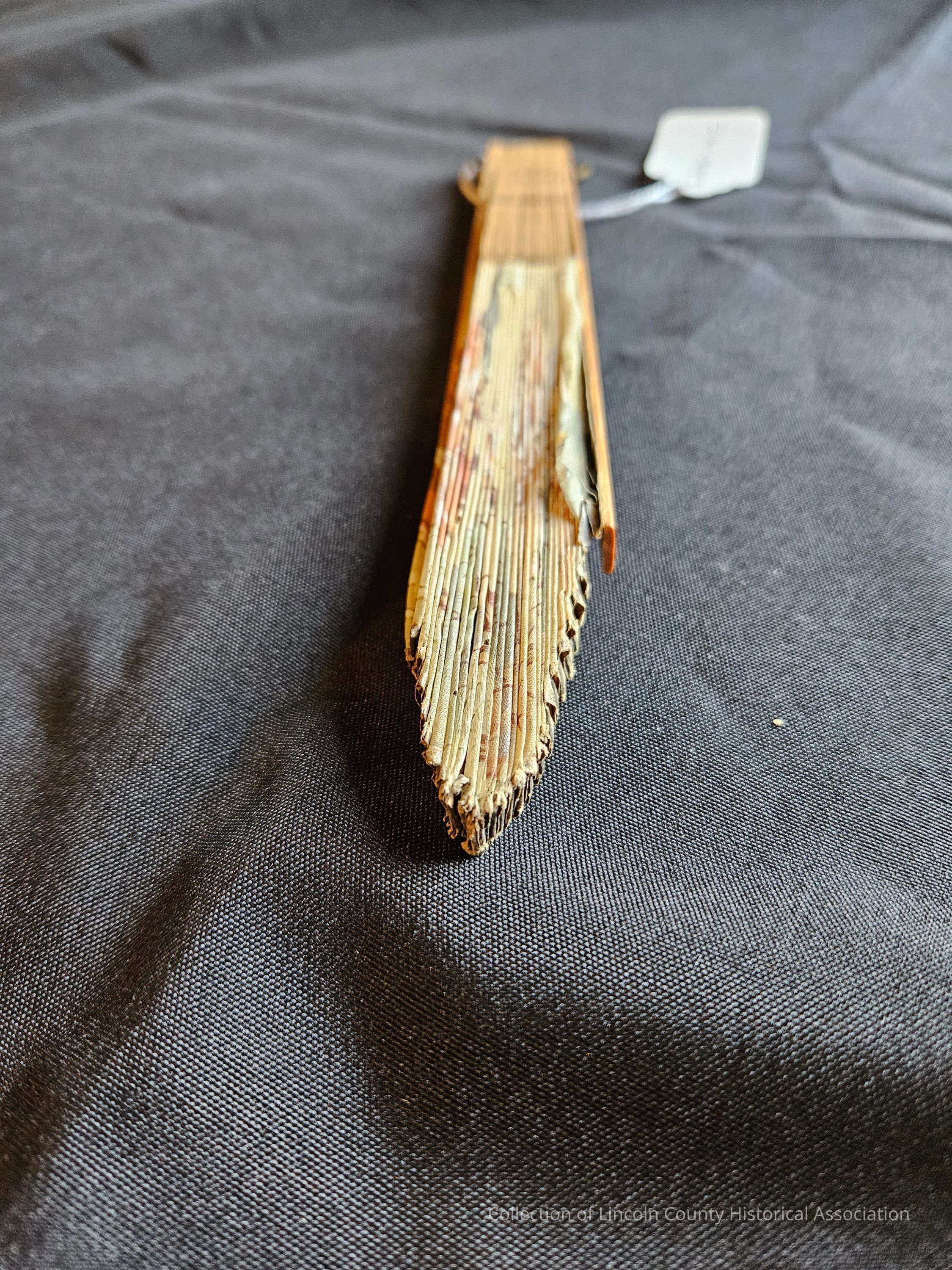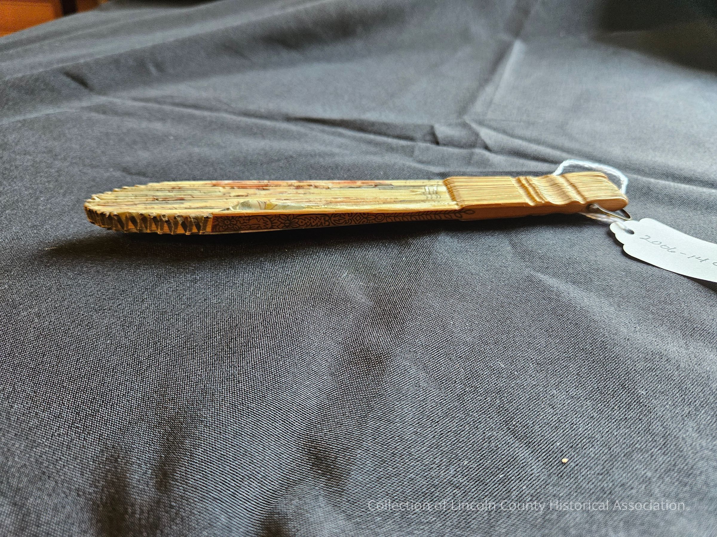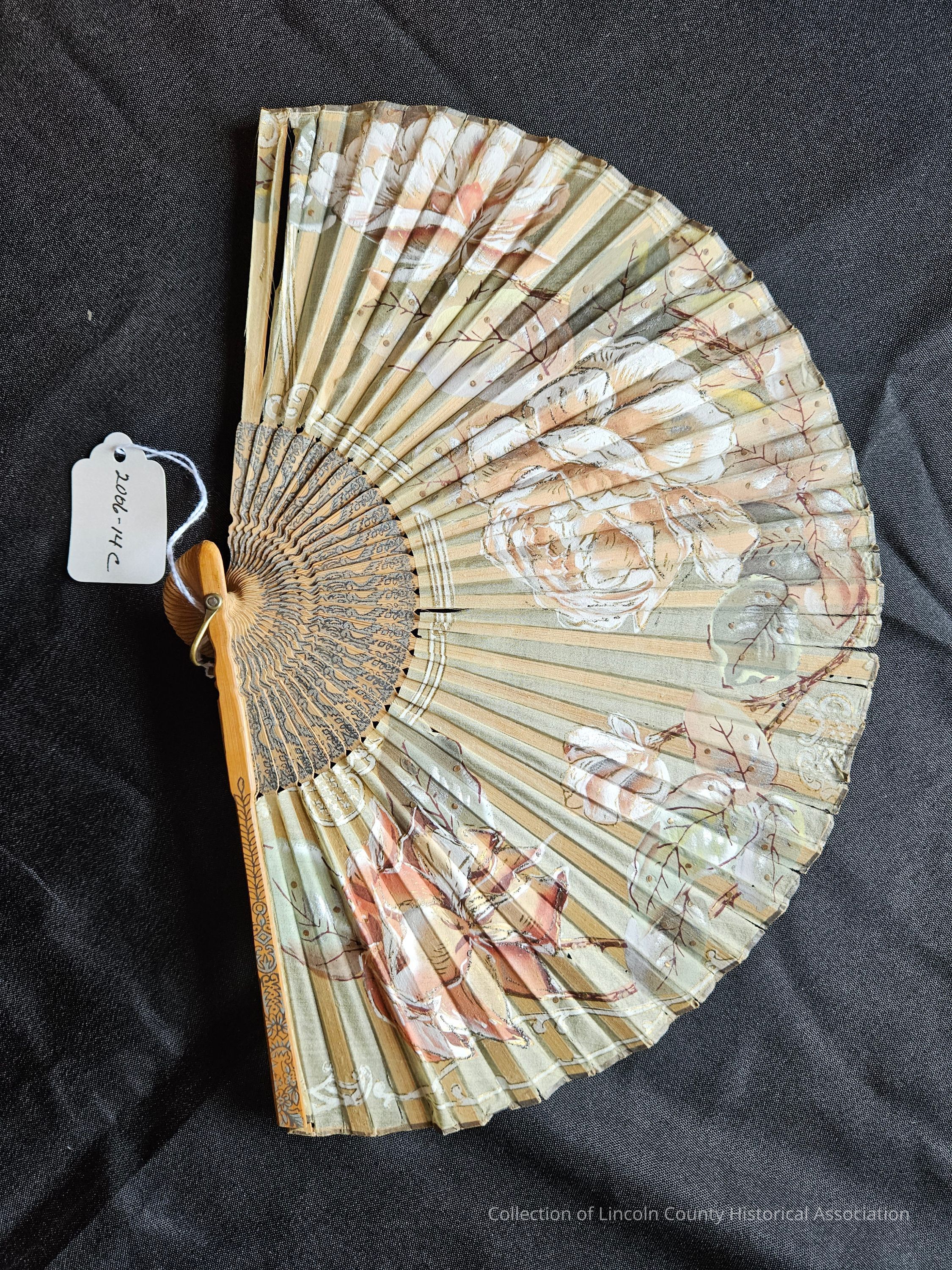 Silk fan with hand painted pink floral design. 30 bamboo sticks with silver design. Tapered edges with silver embossing. Fan is longer in center. Metal pivot.Clothing/Dress/Costume Details