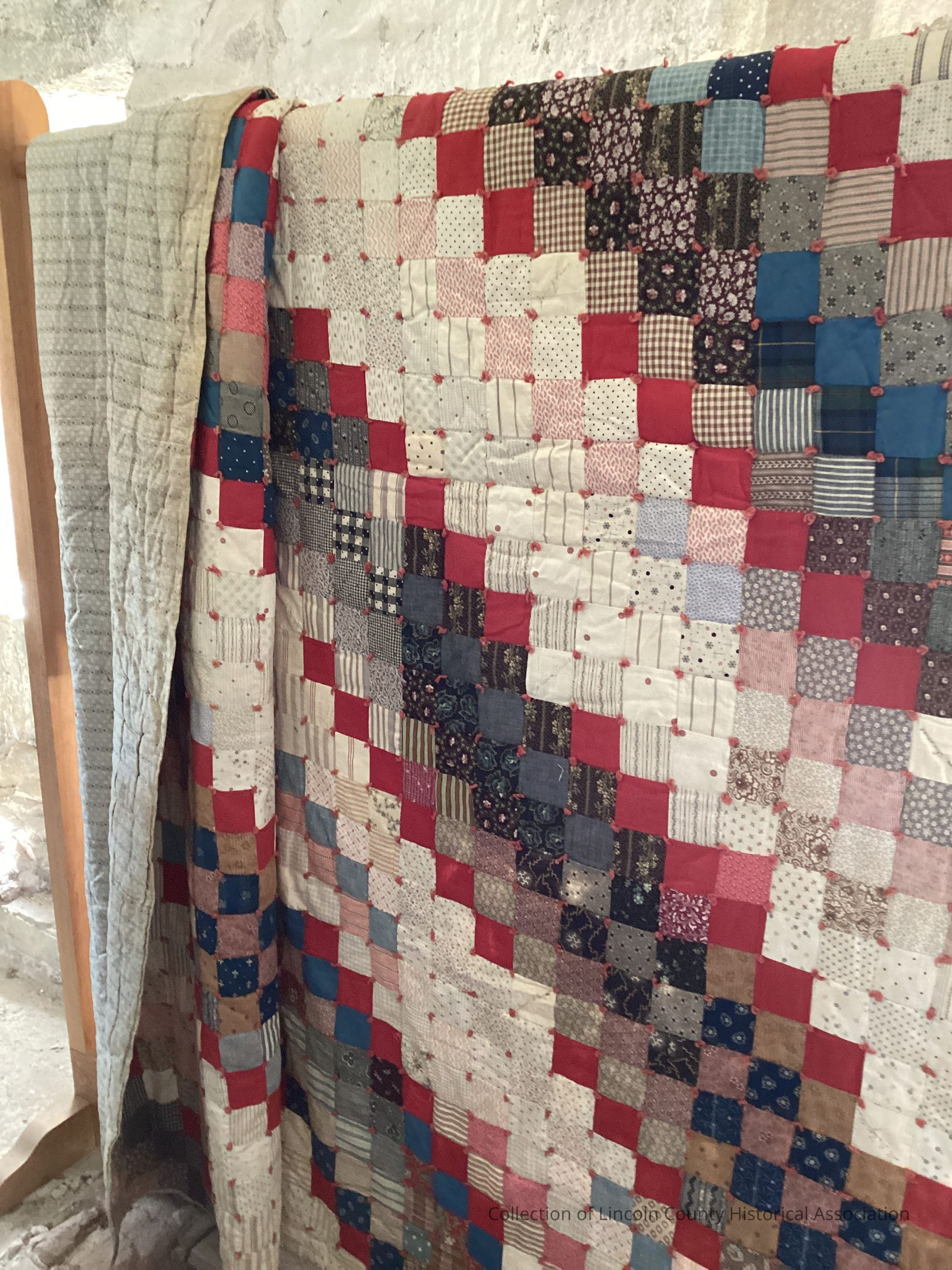 Orff's corner signature quilt. Quilt of many patterned squares. Lining is a gray pattern. Quilt originates from Orff's corner in Waldoboro and names on the quilt include: Killerman, Morse, Fales, Freeman, Robinson, Farnham, Taylor, Mahoney, Grover, and Young.Made/Created