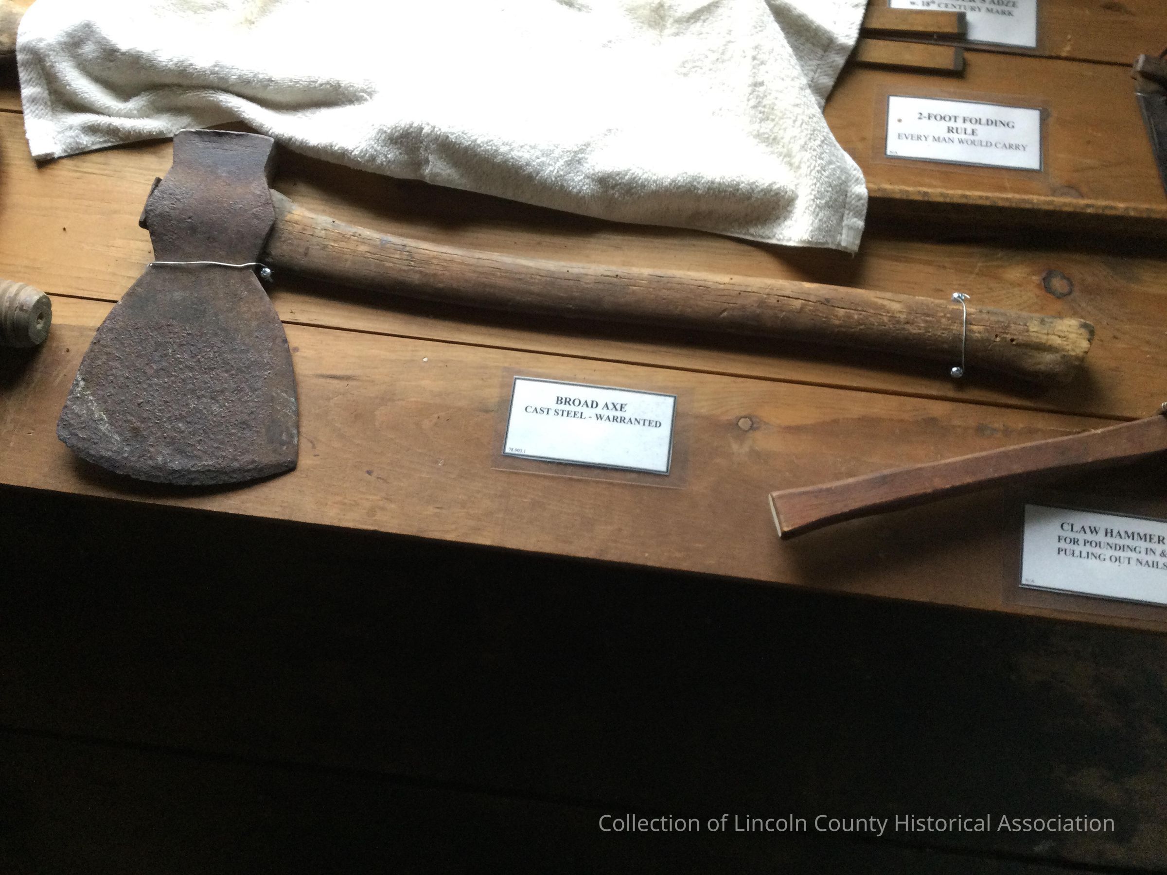 Wood and iron broad axe. A flat eye, head, and chisel blade. Axe has a bent handle.Made/Created